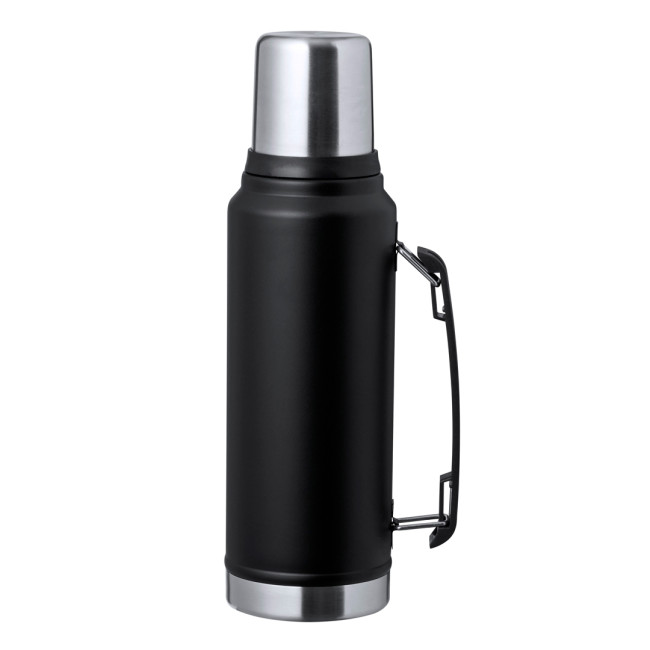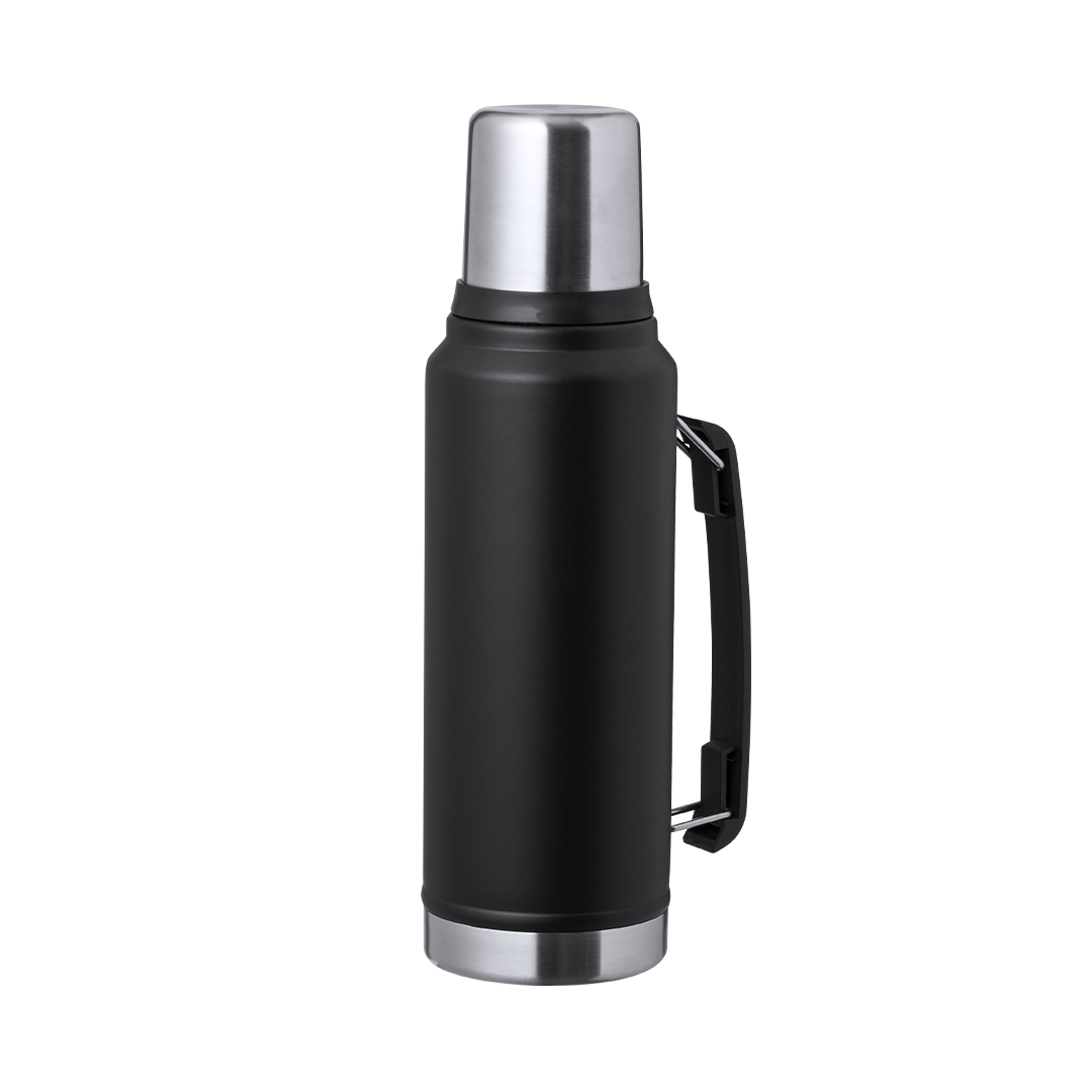 Thermo in acciaio inox con capacità di 1 litro. Combinazione di colore nero e acciaio lucido con finitura elegante, chiusura a vite con tappo a forma di bicchiere da 200 ml e maniglia laterale per un facile trasporto. Confezionato in una scatola kraft di design.
