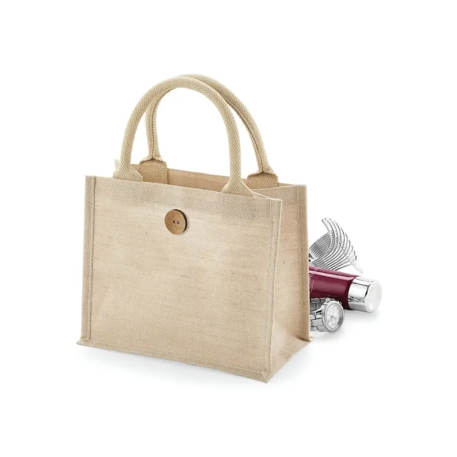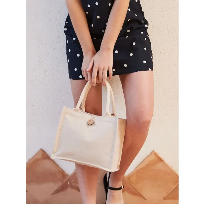 Juco laminato (mix 75% juta, 25% cotone). Borsa a chiusura con cordino e bottone in legno. Etichetta removibile. Lunghezza manico: 35 cm, dimensioni: 26 x 22 x 14 cm, capacita': 6 litri, area stampabile: 18 x 14 cm.