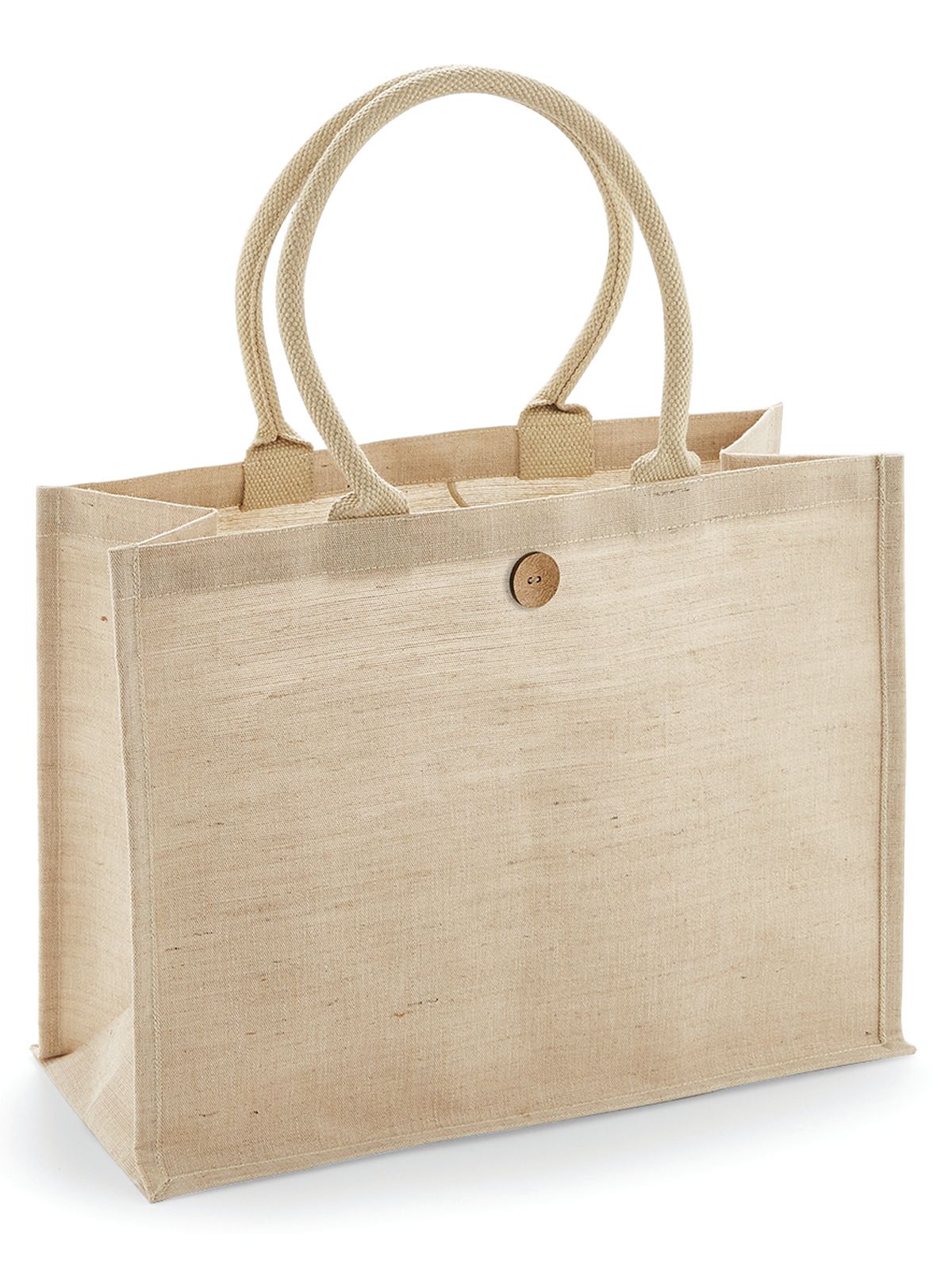 Juco laminato (mix 75% juta, 25% cotone). Borsa con chiusura con cordino e bottone in legno. Etichetta removibile. Lunghezza manico: 55 cm, dimensioni: 42 x 33 x 19 cm, capacita': 21 litri, area stampabile: 34 x 24 cm.