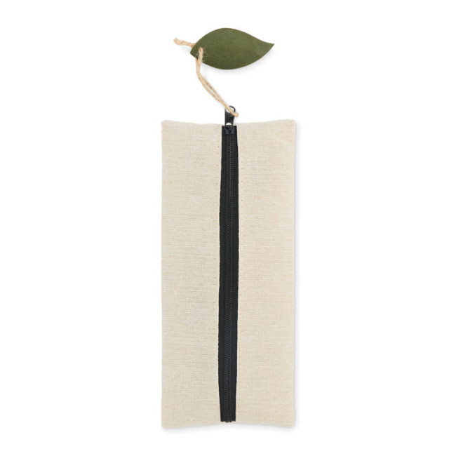 Set cancelleria in astuccio di iuta e cotone con righello in legno da 15 cm, matita in legno, penna a sfera in carta, gomma e temperino in legno. Colore naturale e astuccio riutilizzabile.