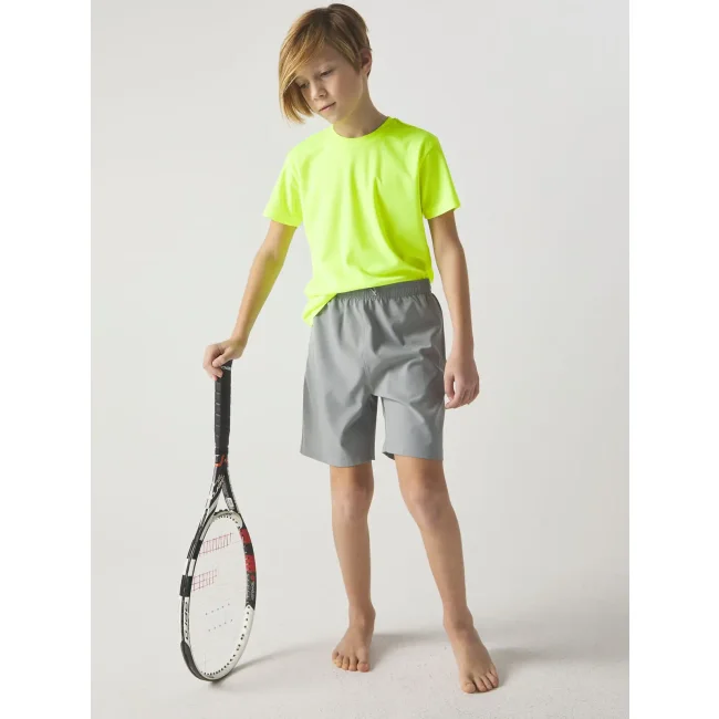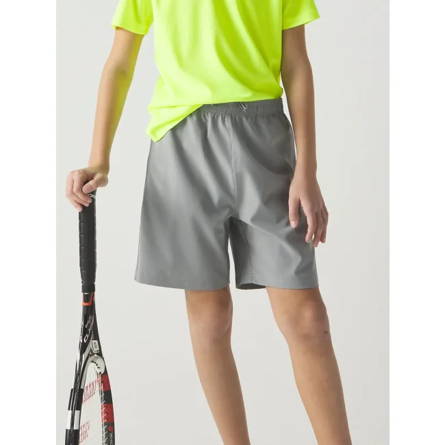 94% poliestere, 6% lycra. Pantaloncino workout da bambino, con profonde tasche laterali in rete che lo rendono adatto a padel e tennis, cordino interno per una migliore regolazione in vita, design moderno. Etichetta strappabile.