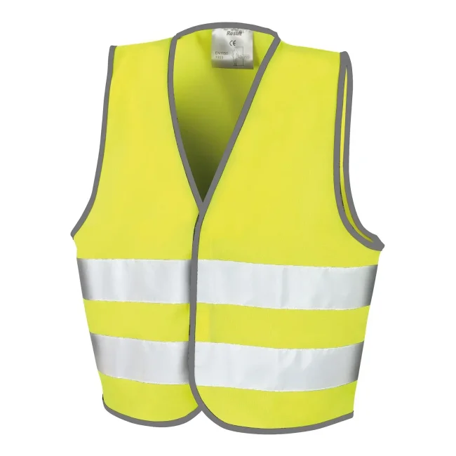100% poliestere. Gilet catarifrangente con bande in contrasto alte 50 mm ciascuna e orlo in contrasto.