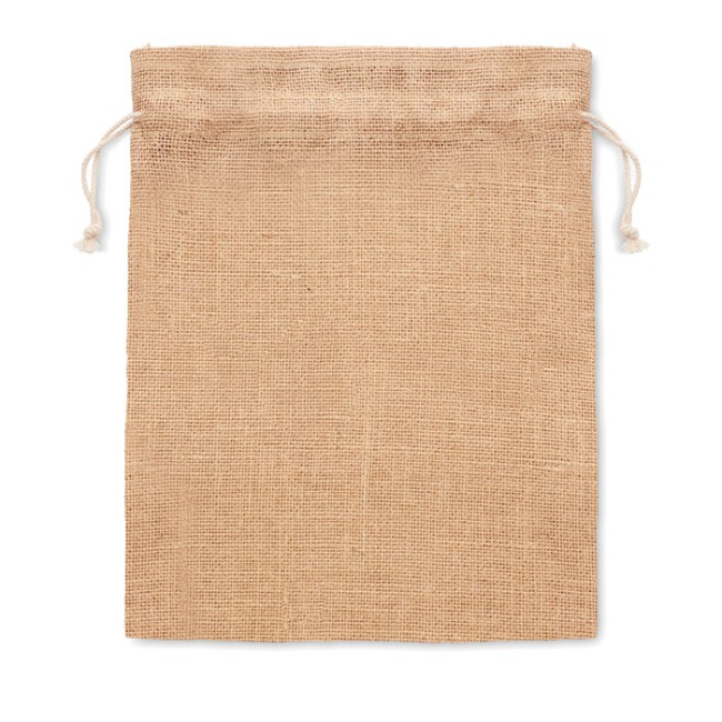 Sacca media in juta con cordino. Misura circa 25x32cm. Questo prodotto è certificato OEKO-TEX® STANDARD 100.