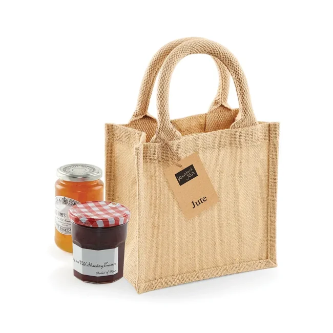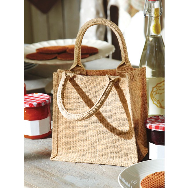 100% Juta laminata. Shopper con manici in cotone. Etichetta removibile. Lunghezza manico: 30 cm, dimensioni: 20 x 20 x 12 cm, capacita': 4 litri, area stampabile: 15 x 10 cm.