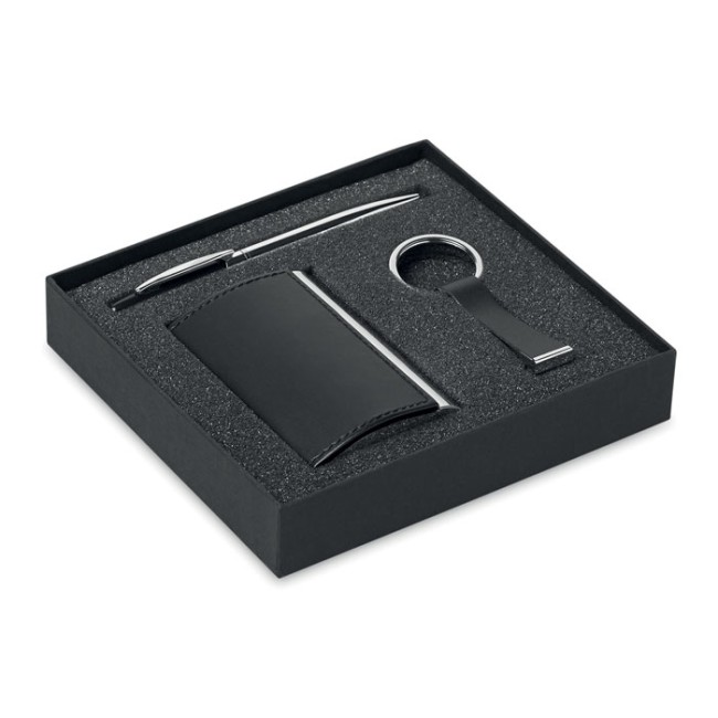 Set business in confezione regalo nera composto da: 1 penna a sfera (refill nero), 1 portachiavi in PU e lega di zinco e 1portabiglietti da visita.
