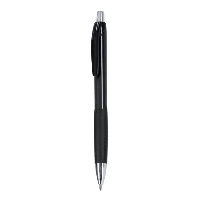 Penna a meccanismo a pulsante in ABS resistente. Realizzato in elegante combinazione di canna. Clip di tono nero. Con pulsante e punta in toni argento, impugnatura con finitura gommosa e corpo lucido. Con inchiostro blu.
