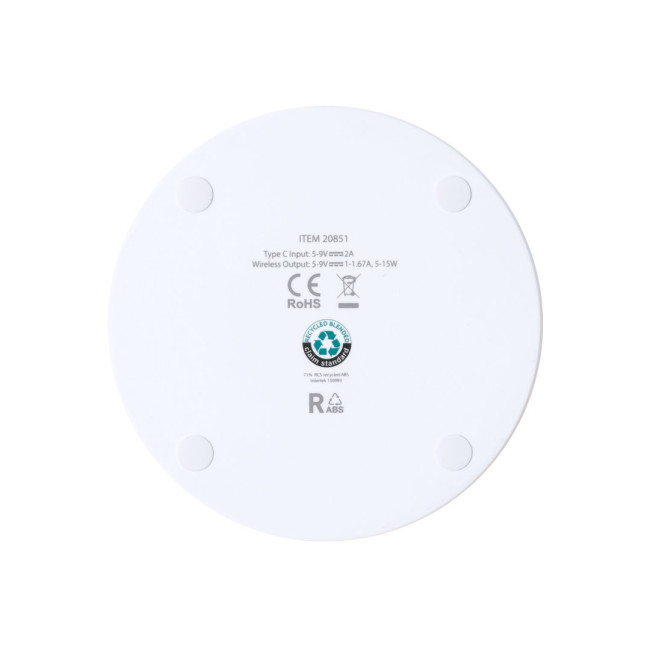 Caricatore wireless da 15W con design circolare realizzato in RABS. Compatibile con i dispositivi dotati di tecnologia di ricarica wireless Qi. Base antiscivolo, con cavo di ricarica di tipo C incluso. Presentato in una scatola individuale dal design kraft, con manuale di istruzioni in inglese e spagnolo.Il RABS è una plastica altamente riciclabile e resistente, con una moltitudine di applicazioni che la rendono una soluzione ecologica. Con certificazione RCS, che ne garantisce l'origine riciclata.Prodotto secondo gli standard RoHS e in conformità ai seguenti requisiti di sicurezza:Sistema di protezione dal surriscaldamento.Sistema di protezione dal sovraccarico.Sistema di blocco per prevenire i cortocircuiti.