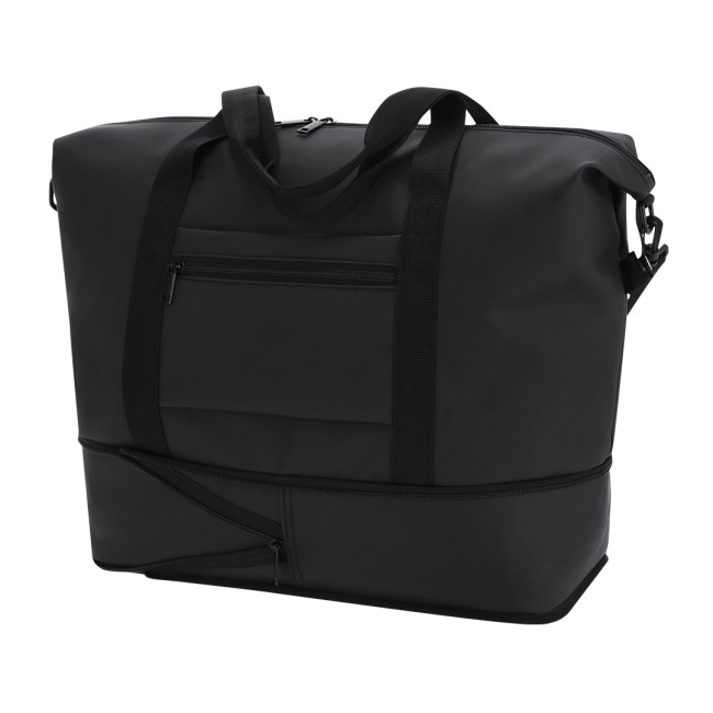 Borsa estensibile realizzata in morbido PU, progettata per offrire una soluzione pratica e versatile. Dotata di tasca frontale per trolley e valigie, che aggiunge funzionalità durante il trasporto. Sistema di chiusura con tiralampo in metallo. Include manici per il trasporto e tracolla regolabile.