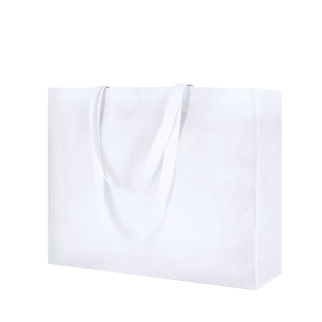 Borsa in TNT da 80 g/m2 in una gamma di colori vivaci. Con manici lunghi 75 cm, soffietto rinforzato con bordino in tinta e finitura cucita. Resistente fino a 4 kg di peso.