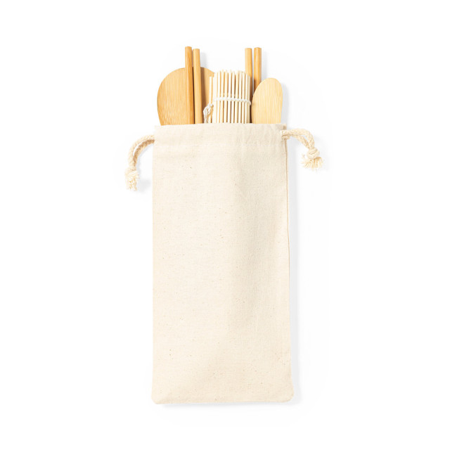Set da sushi da 5 pezzi in bambù naturale. Include 1 tappetino per sushi, 2 set di bacchette, un cucchiaio e un coltello/padella per il riso. Fornito con un sacchetto di cotone per trasportarlo e riporlo facilmente. Presentato in una scatola individuale di eco-design in cartone kraft.