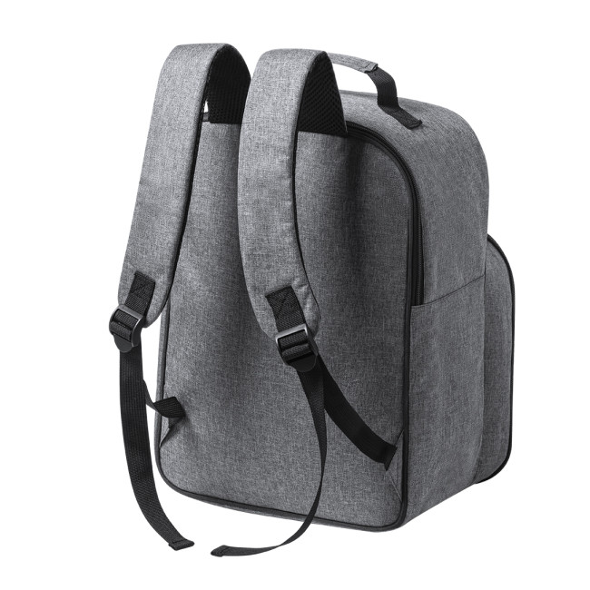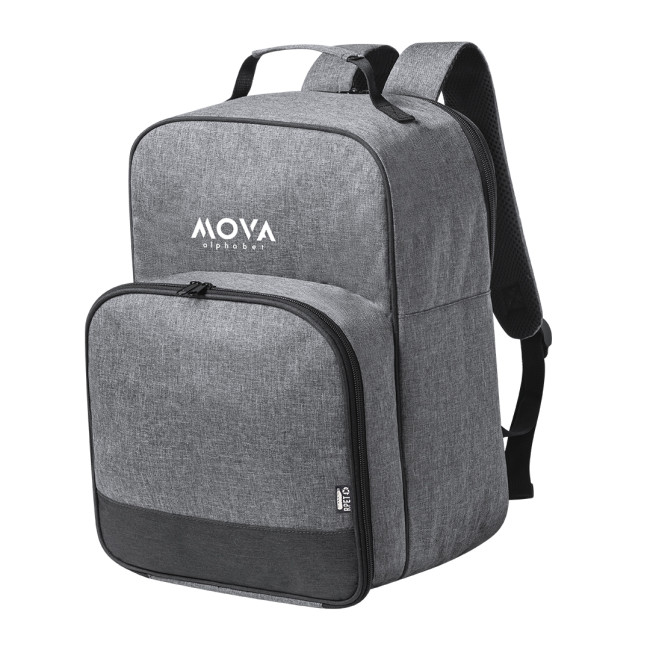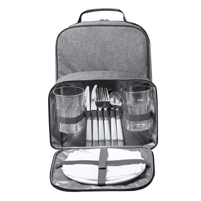Zaino Frigo picnic della Linea Natura, realizzato in resistente RPET 600D di alta qualità, fatto con plastica riciclata per incoraggiare il riutilizzo dei rifiuti plastici e contribuire alla sostenibilità del pianeta. Ideale per 2 persone, con tasca separata per una conservazione sicura dei cibi. Include 2 bicchieri, 2 coltelli, 2 cucchiai, 2 forchette, 2 piatti e 2 tovaglioli. Scomparto frigo con interno in PEVA e comoda maniglia per il trasporto. Cinghie imbottite e schienale imbottito. RPET sull'etichetta.