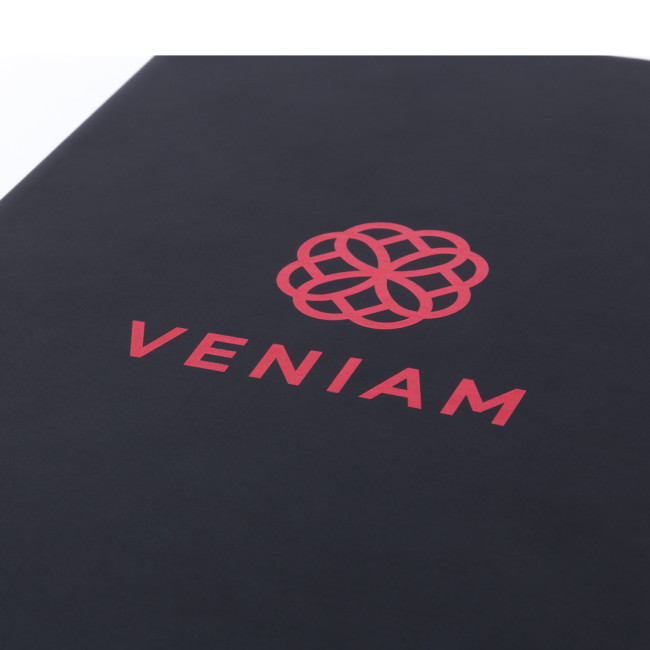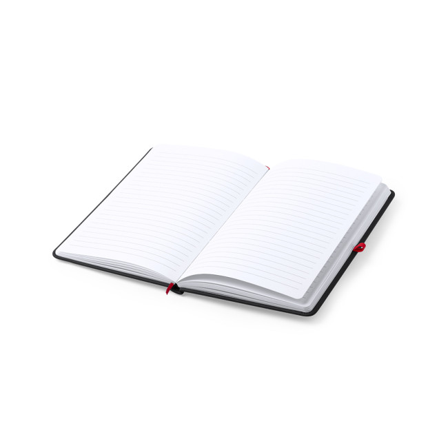 Block notes con copertina morbida al tatto e rifinita in similpelle. In elegante nero, con chiusura elastica, segnalibro e portapenne elastico in colori vivaci. Fodera esterna appositamente progettata per la stampa laser, in modo che la vostra pubblicità o il vostro marchio siano perfettamente incisi in un colore abbinato all'articolo. Include 100 fogli con layout a riga singola.