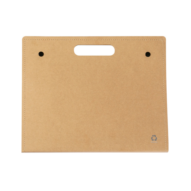 Cartellina ecologica con chiusura a doppio scatto in flessibile cartone riciclato con comode maniglie integrate. All'interno, blocco estraibile da 25 fogli con layout a righe, 25 note adesive grandi, 125 note adesive mini, tasca con patta e portapenne.
