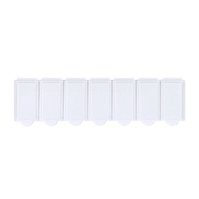 Dispenser settimanale in resistente materiale PP di finitura bianca solida. Include 7 scomparti individuali con chiusura di sicurezza. Senza BPA.
