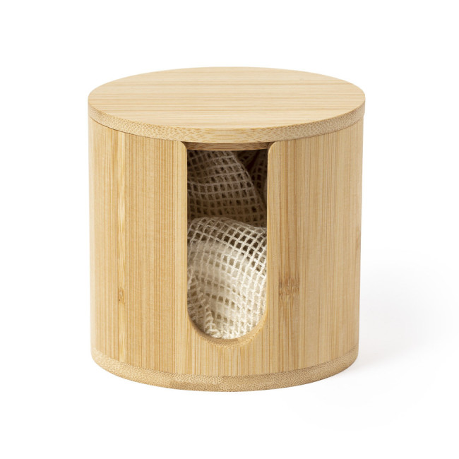 Dispenser per dischi struccanti della linea natura, realizzato in bambù per promuovere l'uso di materie prime naturali. Include 10 dischi di cotone riutilizzabili e un sacchetto per il lavaggio. Confezionato in una scatola individuale di eco-design