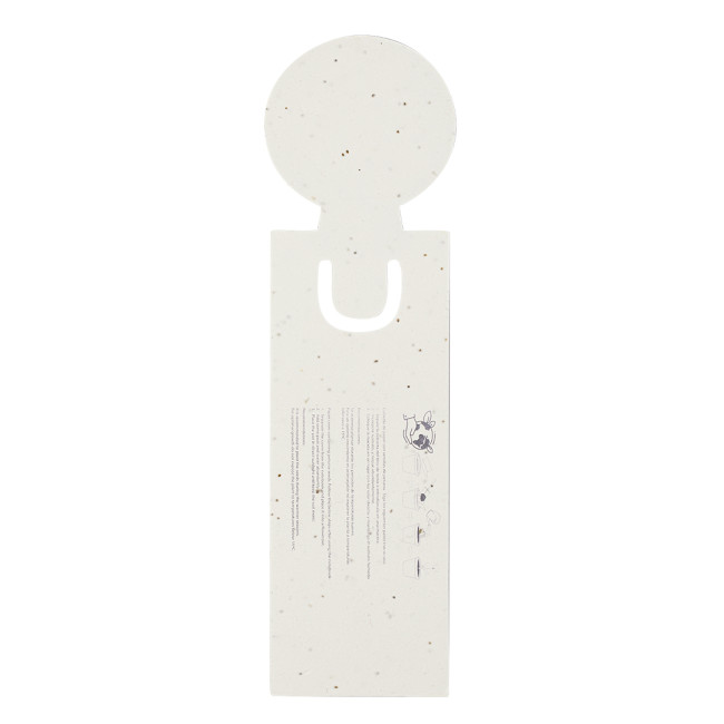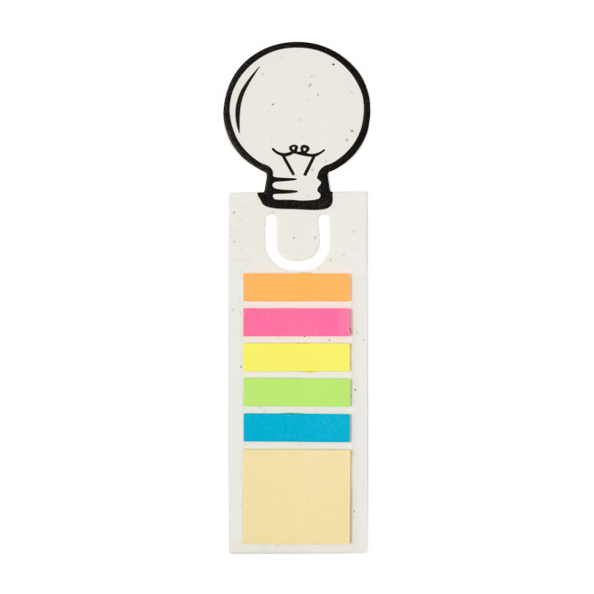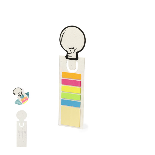 Originale segnalibro in carta di semi, con il caratteristico disegno di una lampadina sulla parte superiore. Dispone inoltre di post-it adesivi di varie forme e colori: 15 post-it 4x4,5 cm in giallo e 75 mini post-it 1,2x4,5 cm in cinque colori diversi. La carta include semi di petunia, che la rendono piantabile alla fine del suo ciclo di vita. Include istruzioni per la semina sul retro della copertina e viene fornito in un sacchetto individuale di carta riciclata.