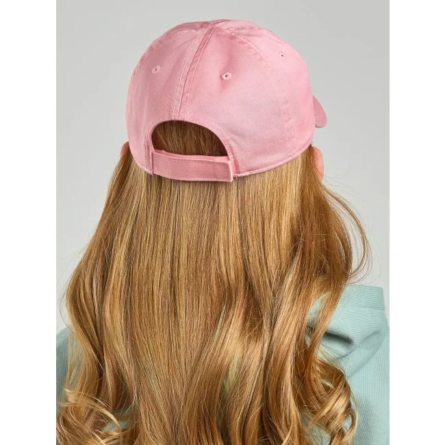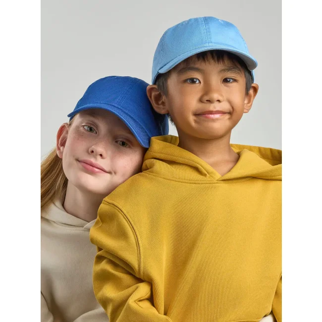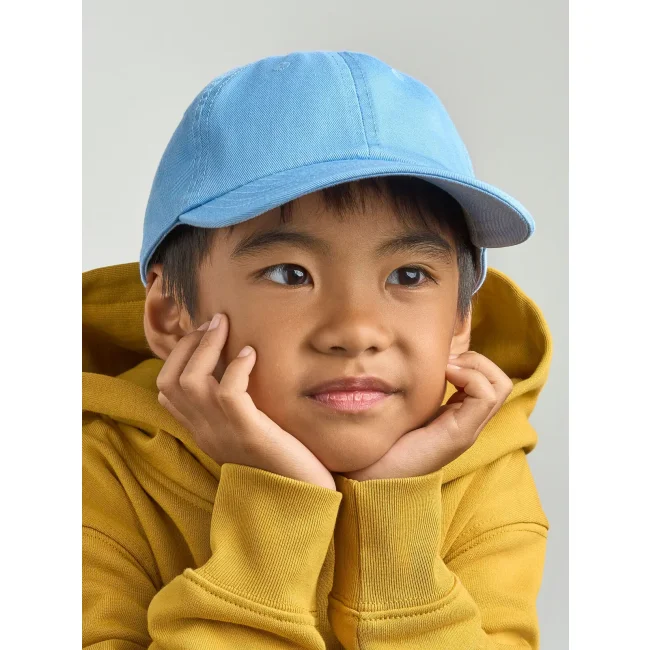 100% cotone organico certificato. Cappellino 6 pannelli destrutturato da bambino in stile dad hat con mid visor e chiusura a strappo. Etichetta removibile.