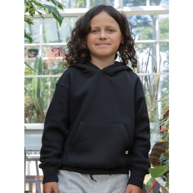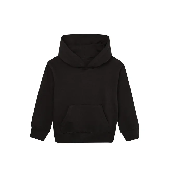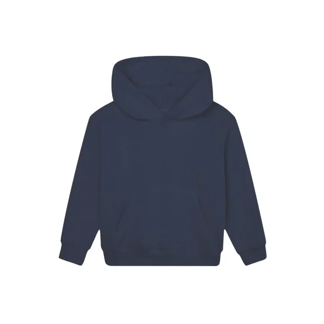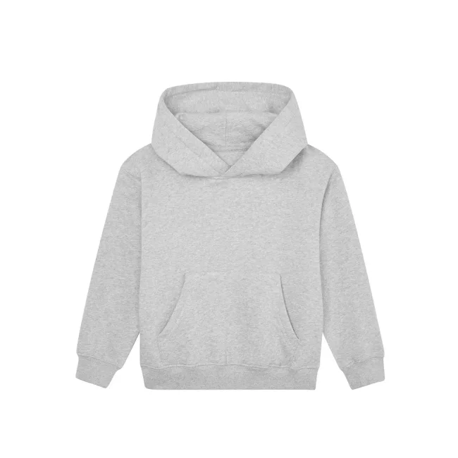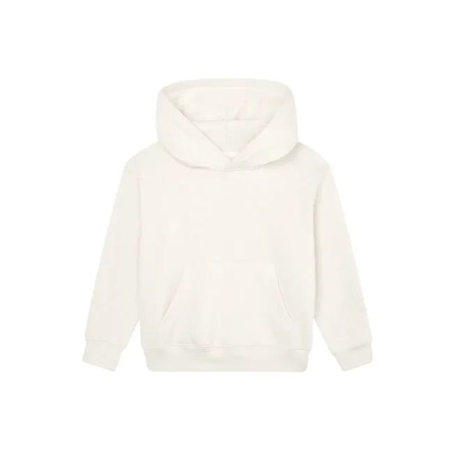80% cotone (organico o in conversione), 20% poliestere riciclato, 280 g/m2. Felpa da bambino vestibilità unisex, maniche set-in, interno felpato, cappuccio doppio strato, interno felpato, nastro di rinforzo al collo a contrasto. Polsini e orlo a costine, tasca a marsupio frontale. Etichetta taglia removibile sul collo. Etichetta con istruzioni di lavaggio in cotone organico.