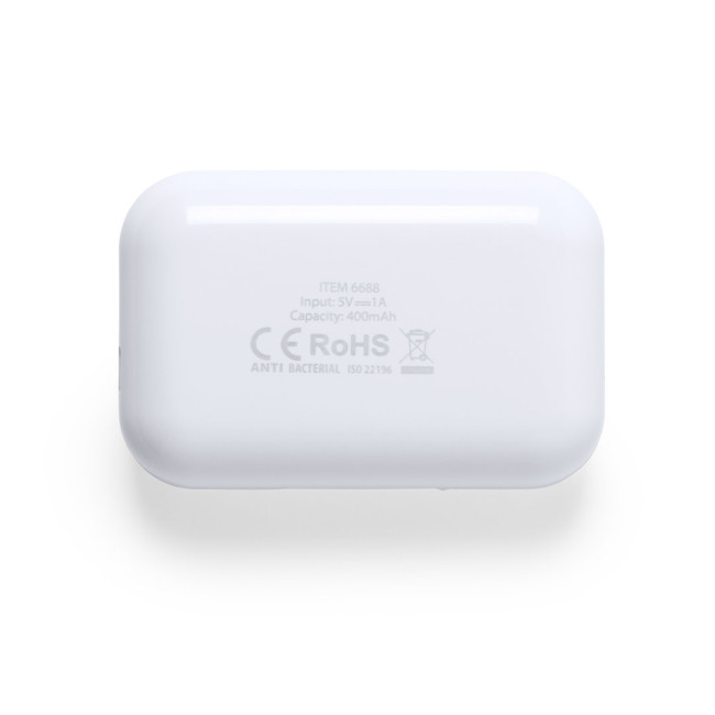 Auricolari in-ear antibatterici con elegante finitura bianca e connessione Bluetooth® 5.0. Realizzati in resistente materiale ABS lucido e dal design ergonomico, includono un pulsante touch control integrato nell'auricolare, con base di ricarica abbinata. Funzione vivavoce e ricaricabile, con cavo Micro USB incluso Presentato in una custodia individuale deluxe con coperchio incernierato e una scatola dal design accattivante. I prodotti con trattamenti antibatterici sono in grado di ridurre drasticamente le cariche batteriche presenti sulle superfici dei materiali, grazie all'incorporazione di agenti microbici permanenti statici, altamente efficaci nell'inibire e prevenire la contaminazione batterica. Articolo secondo la norma ISO 22196, che determina l'attività antibatterica in materiali plastici e superfici non porose, che permette di conoscere l'efficacia dell'inibizione microbica che gli additivi hanno sugli oggetti trattati attraverso una valutazione quantitativa