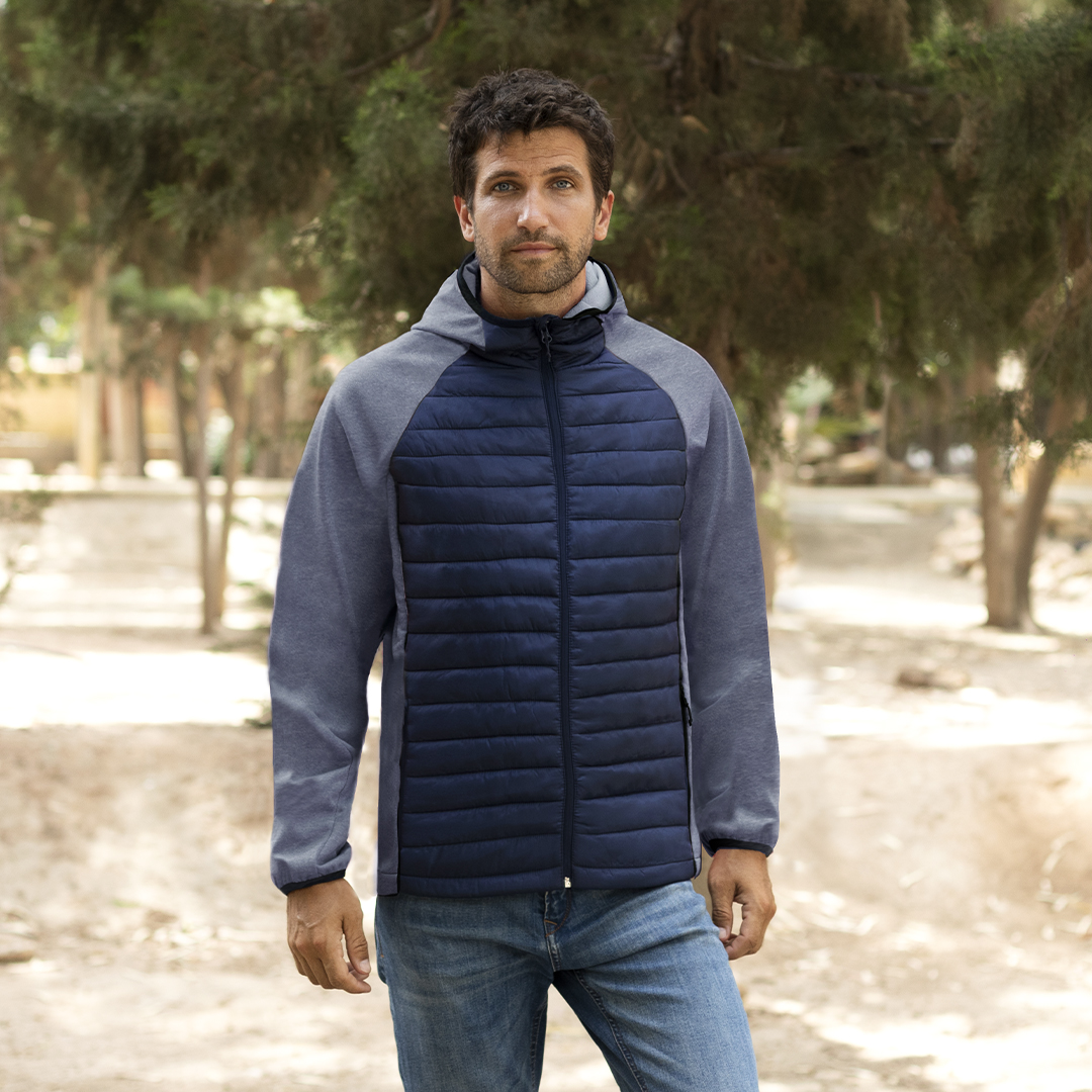 Giacca unisex traspirante realizzata in una combinazione di soft shell e poliestere, con tessuto imbottito in piuma al tatto sul davanti e sul retro. Cappuccio e maniche in stile raglan con bordo elastico su collo, polsini e fondo. Elegante combinazione di colori nero e grigio, resistente al vento e all'acqua. Chiusura con cerniera e tasche laterali con cerniera per una facile apertura. Disponibile nelle taglie S, M, L, XL, XXL.