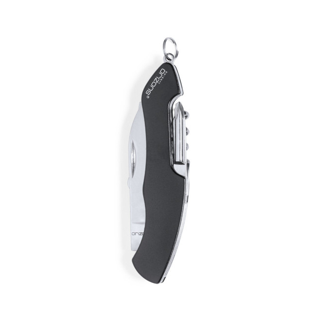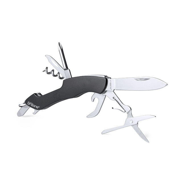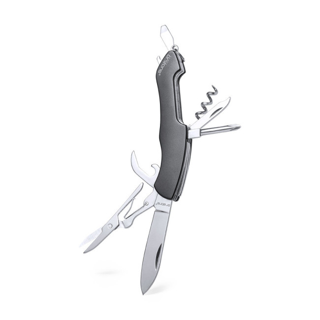 Coltellino multiuso by Orizons con accessori in acciaio inox a 10 funzioni e manico in alluminio dai colori vivaci. Con coltellino, forbici, apriscatole, apribottiglie con cacciavite piatto, cacciavite a croce, punzone con lima e cavatappi. Con anello portachiavi e presentato in una scatola dal design accattivante con logo del marchio.