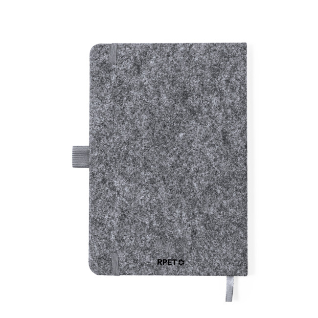Block notes con supporto dalla copertina rigida realizzata in feltro RPET 300D. Con originale supporto per smartphone e tablet integrato nella copertina, realizzato in bambù. Include una chiusura elastica e un portapenne abbinato, con 80 pagine a righe all'interno. Con logo RPET sul retro della copertina e presentato in un sacchetto individuale riciclato.Il feltro RPET è il risultato della combinazione del processo di riciclo delle materie plastiche con la tecnica millenaria della lavorazione del feltro, dando vita a un materiale di eco-tendenza che, oltre a essere di origine riciclata, diventa anche riciclabile.