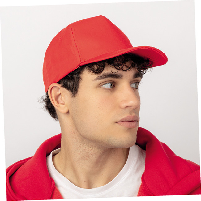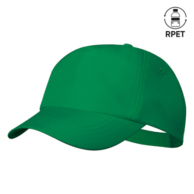 cappello 5 pannelli in RPET fascia tergisudore in colore abbinato occhielli ricamati frontalino rinforzato visiera rigida sagomata chiusura in velcro regolabile in colore abbinato 140 g/m2
