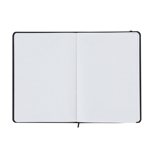 Blocco note fatto di elegante PU. Con copertine rigide e 96 fogli di design tratteggiati. Include nastro per segnalibri e nastro elastico sul coperchio per una chiusura sicura.
