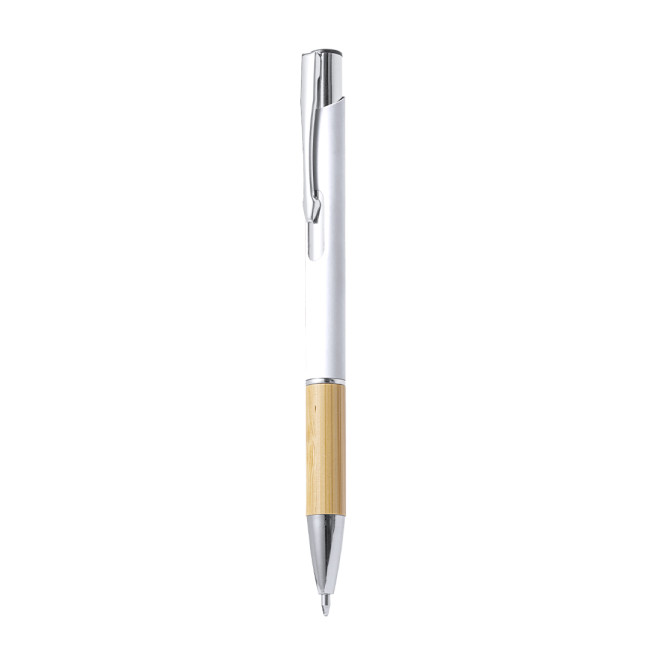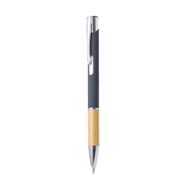 Elegante penna della linea natura con meccanismo a pulsante. Fusto in alluminio resistente con finitura gommata e impugnatura in bambù, con fusto in un'ampia gamma di colori distintivi. Clip in metallo, meccanismo a pulsante e inchiostro blu. Presentate in un astuccio individuale riciclato.