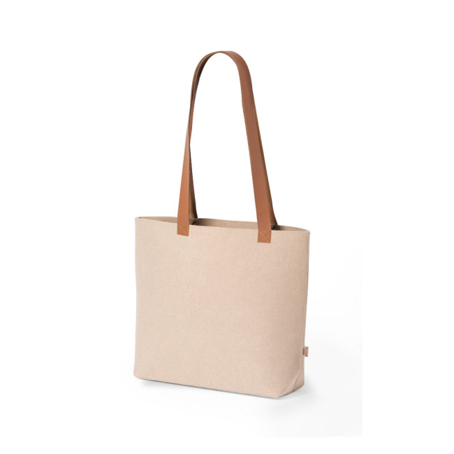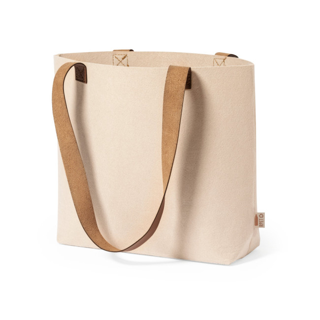 Borsa della linea natura realizzata in feltro RPET, con lunghi manici rinforzati (70 x 3 cm) in similpelle marrone. Rifiniture cucite e soffietto sul fondo, con corpo disponibile nei colori grigio e naturale. Etichetta esterna con logo RPET. Resistenza fino a 6 kg di peso.Il feltro RPET è il risultato della combinazione del processo di riciclo delle materie plastiche con la tecnica millenaria di produzione del feltro, che dà vita a un materiale di eco-tendenza che, oltre a essere di origine riciclata, diventa anche riciclabile.