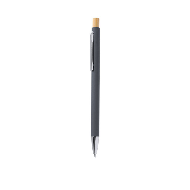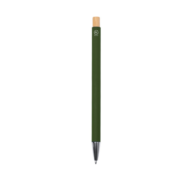 Penna a sfera con meccanismo a pulsante realizzata in alluminio riciclato. Pulsante in bambù e corpo con finitura in gomma opaca. Clip metallica e distintivo di alluminio riciclato nella parte superiore della penna, in inchiostro blu.L'alluminio riciclato è un materiale con possibilità di riciclaggio quasi infinite, senza perdere le sue proprietà originali e consumando meno energia in questo processo.Certificazione GRS (Global Recycled Standard / Standard di Riciclaggio Globale), che garantisce l'origine riciclata del materiale utilizzato per fabbricare il prodotto.Materiali come il Bambù promuovono l'uso di materie prime naturali riducendo le emissioni inquinanti. Inoltre, il bambù proviene da una pianta di grande resistenza e versatilità, con crescita e rigenerazione rapide, costituendo un'ottima alternativa all'uso del legno tradizionale.Cartuccia Jumbo