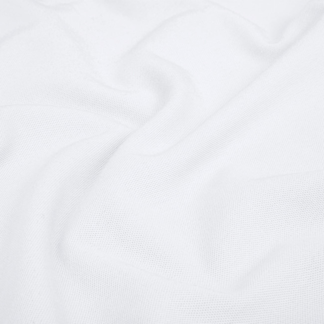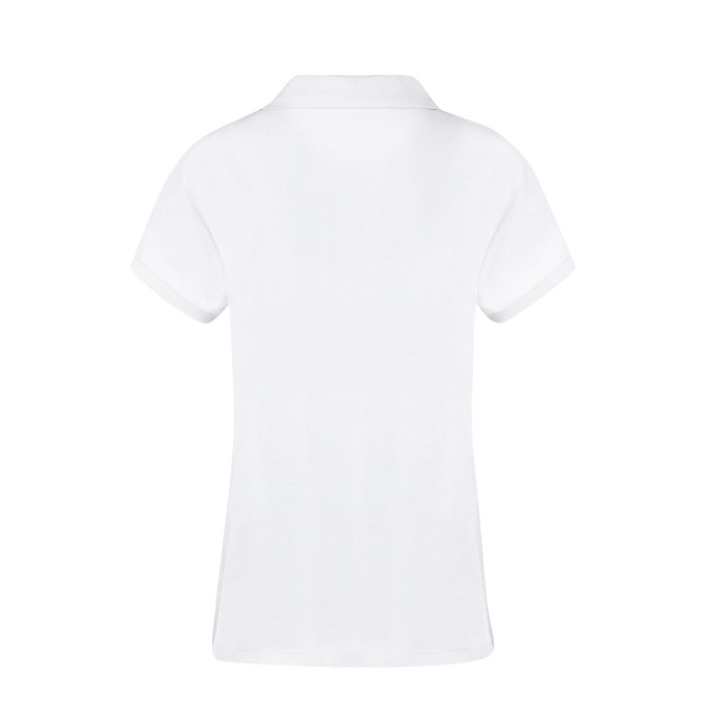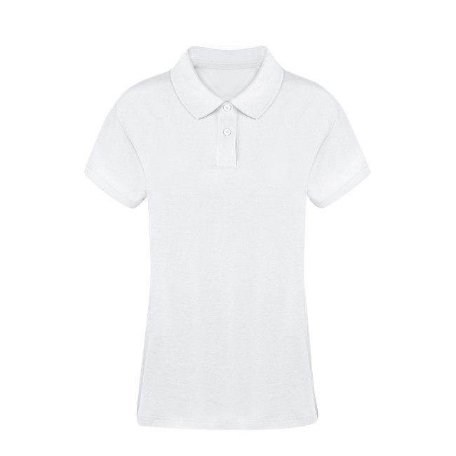 Polo da donna in piqué di colore bianco. In materiale 100% cotone da 220 g/m2. Presenta due chiusure con due bottoni in tinta e spacchetti laterali al fondo. Etichetta facilmente rimovibile. Taglie S, M, L, XL, XXL.