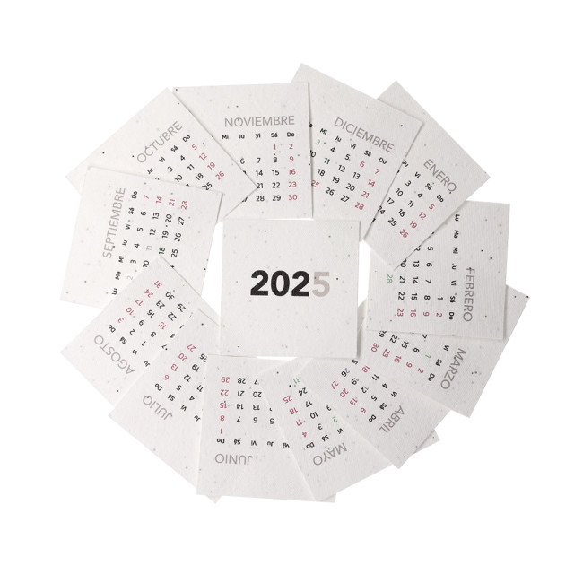 Calendario piantabile in carta seminabile. Include 13 fogli con semi di petunia in vari colori, trasformandosi in carta piantabile dopo il suo ciclo di vita. Design del mese corrente, con feste nazionali segnate in rosso e feste regionali in verde. Presentato in un supporto di cartone.