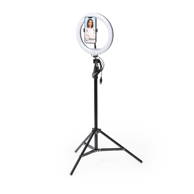 Set di luci. Include anello luminoso, treppiede da tavolo e treppiede da terra con altezza regolabile fino a 180 cm. 120 LED, con 3 posizioni di illuminazione e 10 livelli di intensità luminosa regolabili. Alimentato dalla connessione USB. Cavo con controller e telecomando incluso. Confezionato in una scatola dal design accattivante.