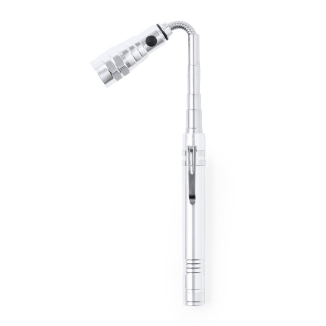 Pratica e versatile lanterna in alluminio con testa estensibile (triplicando la lunghezza) e flessibile per arrivare ovunque, è anche dotata di magneti che si adattano alle varie esigenze. Dispone di 3 potenti LED per un'illuminazione efficiente. È alimentata da batterie a bottone incluse e dispone di una clip metallica per un facile aggancio. Confezionato singolarmente in una scatola kraft di design.