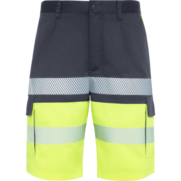 Short multitasche bicolore ad alta visibilità.·Tessuto resistente.·Girovita elasticizzato sul retro.·Due tasche anteriori con dettagli a contrasto.·Due tasche posteriori con pattina e chiusura velcro con dettagli a contrasto.·Due tasche cargo con pattina e chiusura velcro con dettagli a contrasto.·Due fasce segmentate riflettenti sulle gambe. ·Pannelli fluorescenti sulle gambe·Etichetta Roly WRK esterna.·Cicli di lavaggio: x25