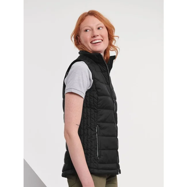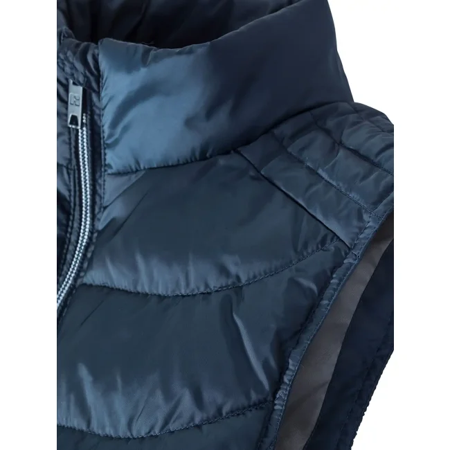 100% poliestere. Tessuto DWR ad alte prestazioni trattato con Aquapel di Nanotex senza fluoro e PFC . Gilet con imbottitura Dupont Sorona. Collo alto con protezione per il mento e pattina antivento interna, zip, fodera e dettagli a contrasto. 2 tasche laterali e 1 tasca interna con zip, Orlo regolabile con coulisse. Discreto accesso per decorazioni sul lato interno sinistro del torace.