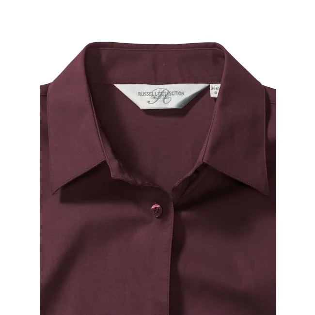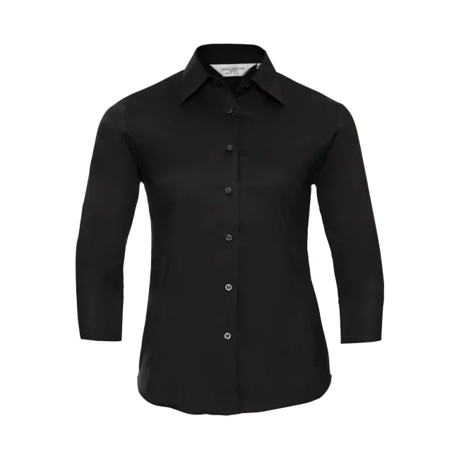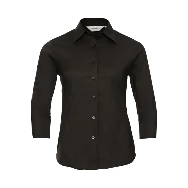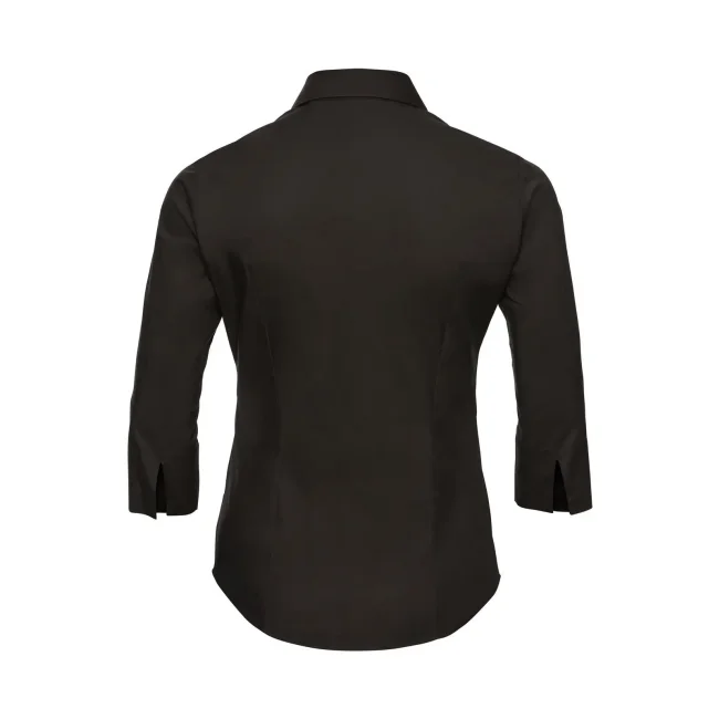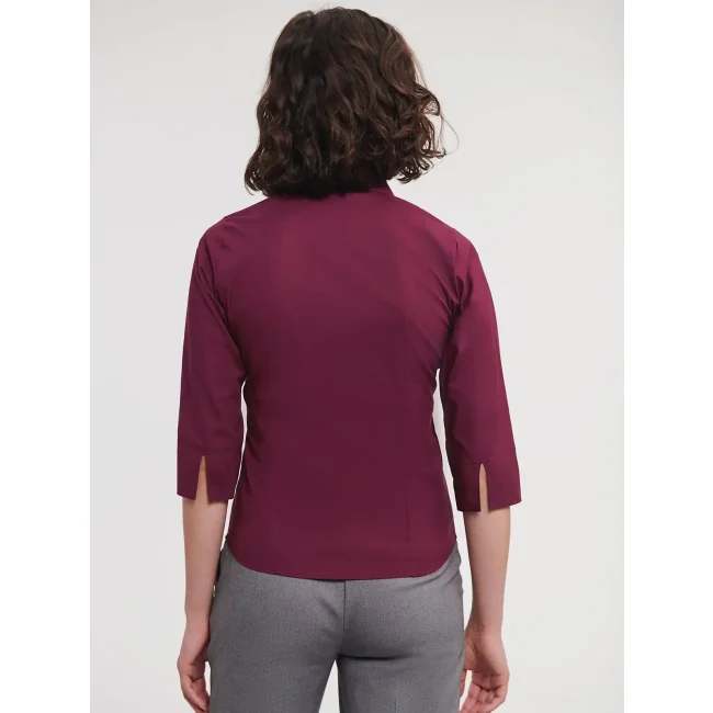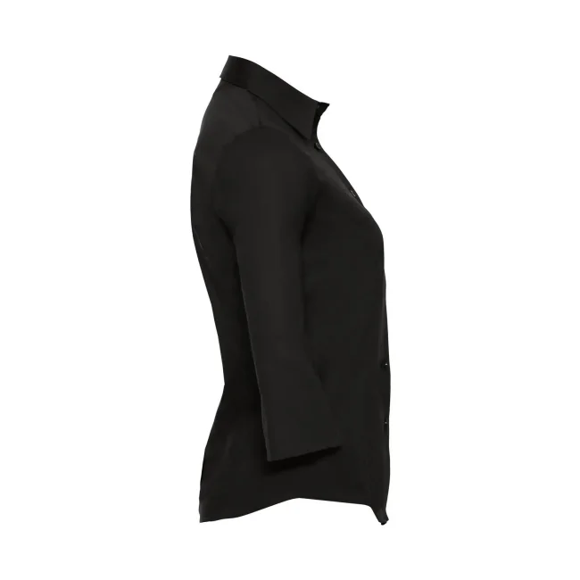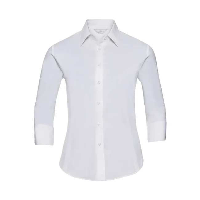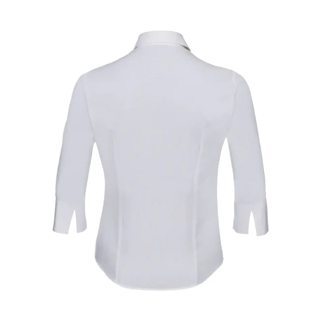 97% cotone, 3% elastane. Camicia elegante, colletto semiaperto con bottone singolo perlato, orlo stondato. Manica 3/4 con spacchetto e risvolto. Pince dietro e davanti al seno per una vestibilità femminile. Bottone di riserva.