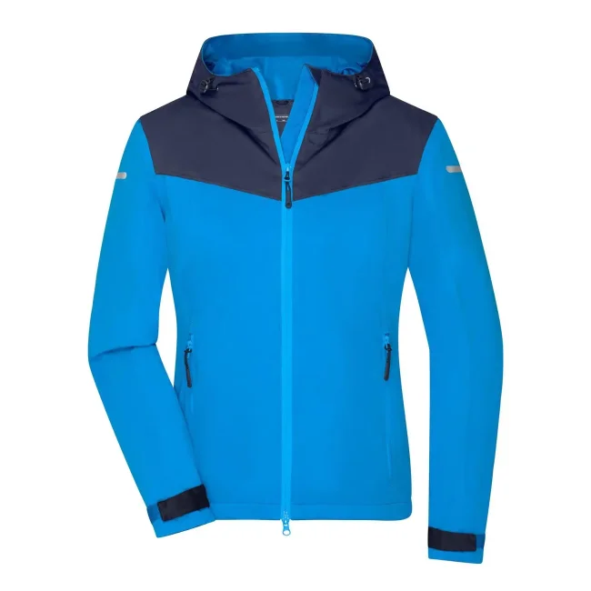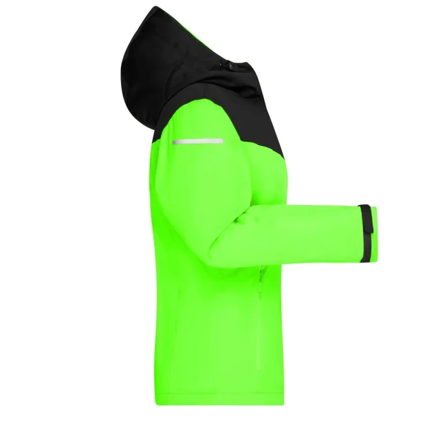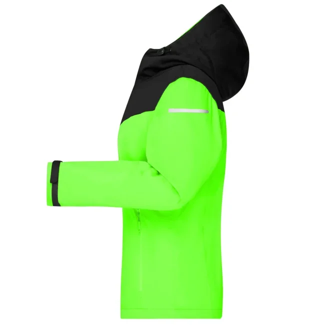 100% poliestere riciclato. Giacca softshell 2 strati foderata in poliestere riciclato con membrana TPU, antivento e antipioggia (10,000 mm colonna d'acqua), traspirante e permeabile al vapore (5,000/m²/24 h). Cuciture nastrate, cerniere waterproof, zip nascosta bidirezionale con protezione per il mento, due tasche laterali, una tasca interna, cappuccio regolabile, polsini regolabili con velcro, vestibilità ergonomica, retro esteso, dettagli riflettenti sulle maniche e nella parte posteriore, zip decorativa sul retro. Taglio leggermente sagomato.