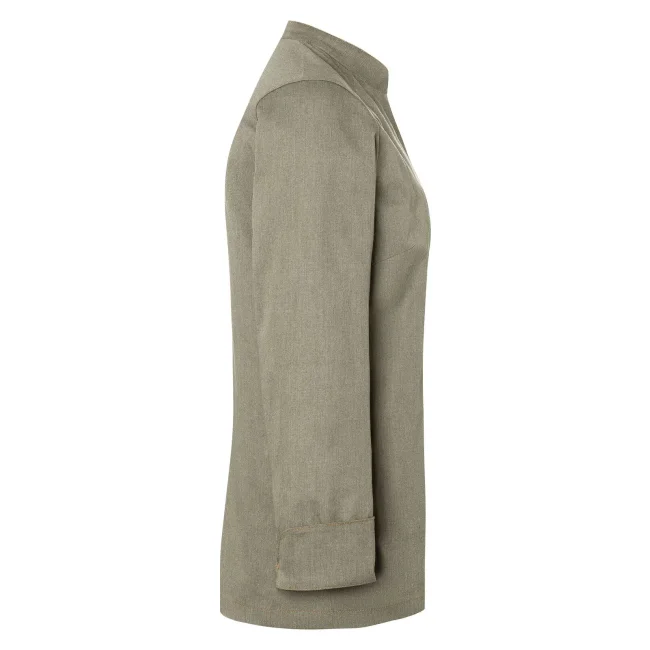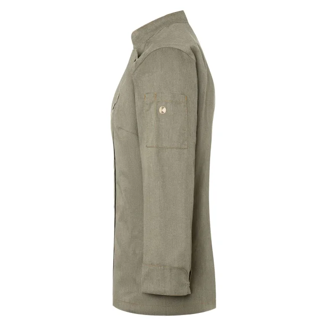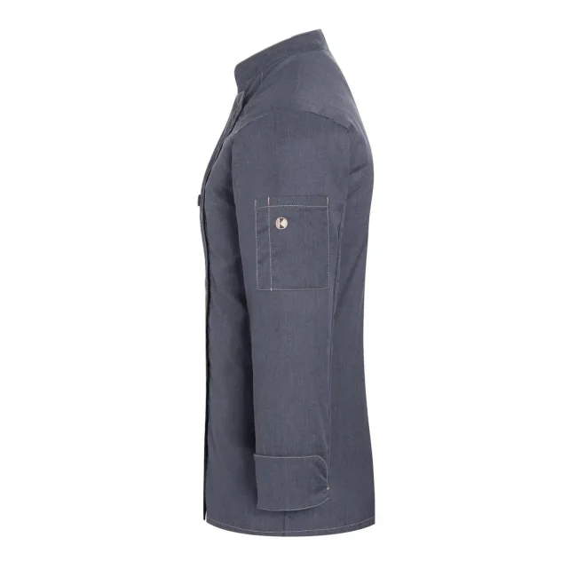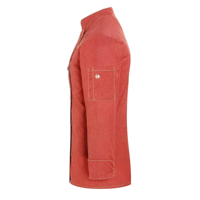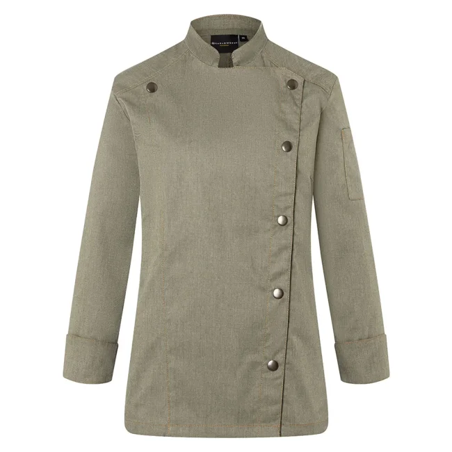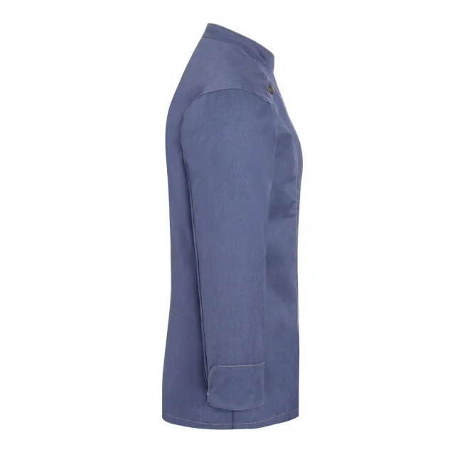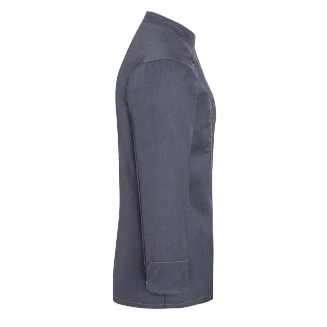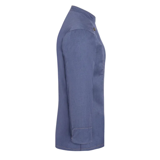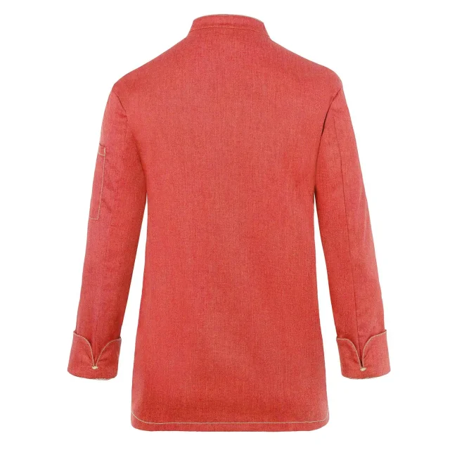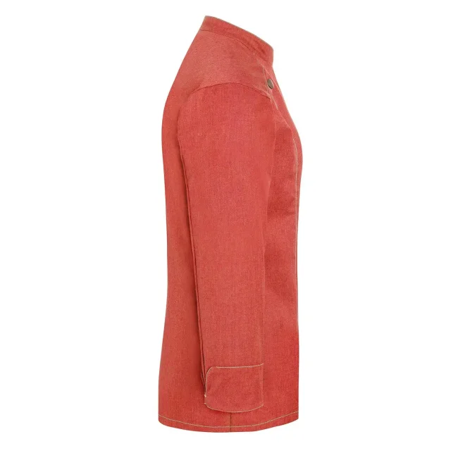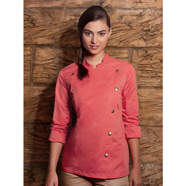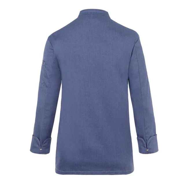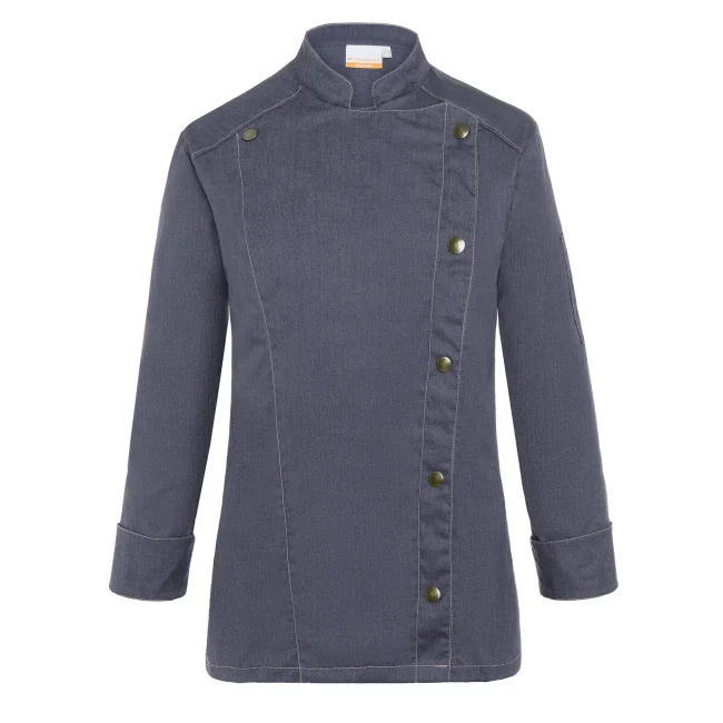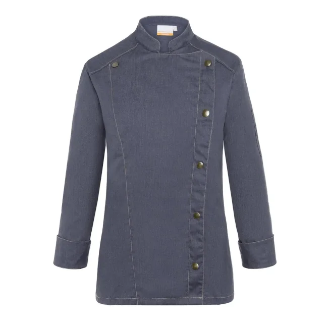 65% poliestere, 35% cotone. 195 g/m² (vintage red: 175 g/m²). Giacca da cuoco da donna in stile jeans, tessuto rifinito, sciancrata. Impunture con filato in contrasto, chiusura asimmetrica con 5 bottoni a pressione, polsini delle maniche con spacco laterale, tasca sulla manica sinistra con portapenne. Idonea per lavaggi industriali.