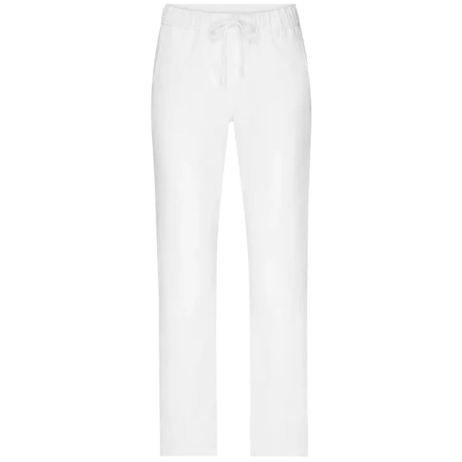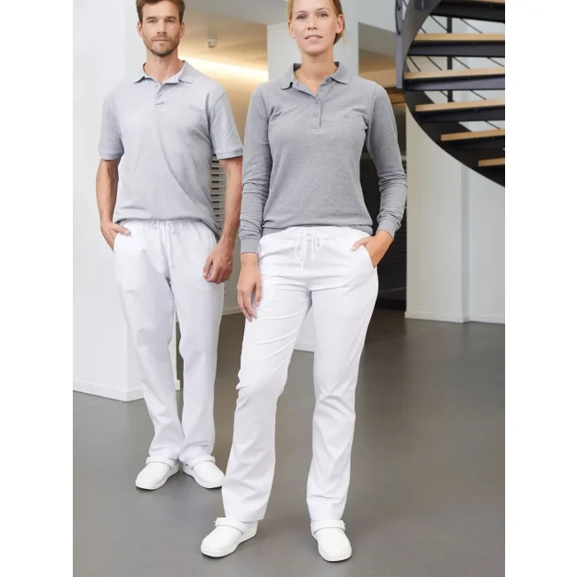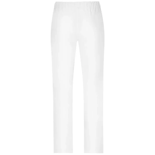 65% poliestere 35% cotone, 200 g/m2. Pantaloni con vita elasticizzata regolabile con cordino, taglio dritto, 2 tasche laterali. Lavabili a 95°C.