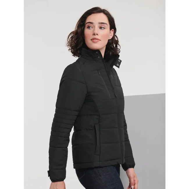 100% poliestere. Tessuto DWR ad alte prestazioni trattato con Aquapel di Nanotex,senza fluoro e PFC Giacca donna con imbottitura ecologica di Dupont Sorona. Taglio moderno. Collo montante con 2 bottoni a pressione e pattina frangivento interna per la protezione dal vento, tasca interna con zip, pattina decorativa per la manica con bottone a pressione. Accesso discreto per la decorazione sul lato sinistro interno del torace.