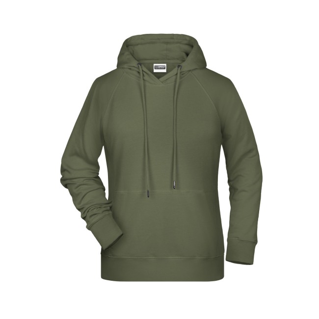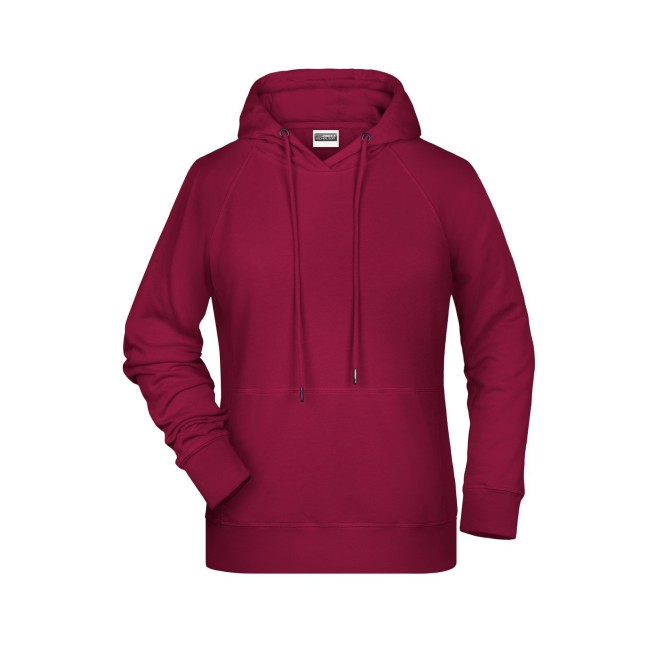 85% cotone organico ring-spun, 15% poliestere. Felpa da donna in tessuto di alta qualità, cappuccio a due strati con coulisse, cuciture laterali divisorie sul davanti, tasca a marsupio, cinturini con elastan, etichetta a strappo, leggermente sfiancata, felpata internamente.