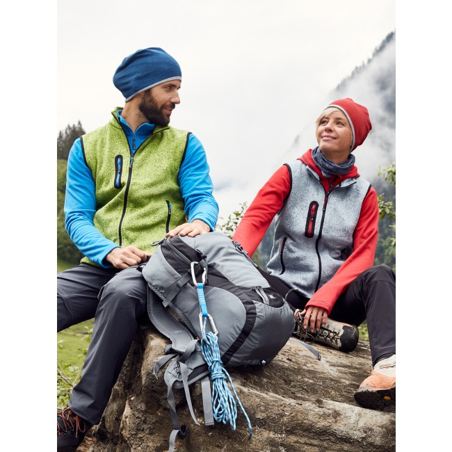 100% poliestere. Soffice, caldo e con finitura easy-care, all'esterno appare come lavorato a maglia, internamente felpato. Sottili cuciture divisorie, Tasche laterali con zip, taschino lato cuore. Inserti a contrasto sull'orlo e sulle maniche