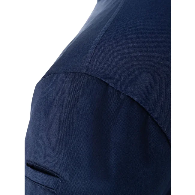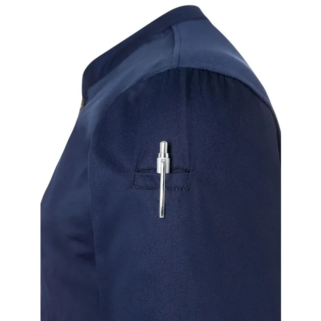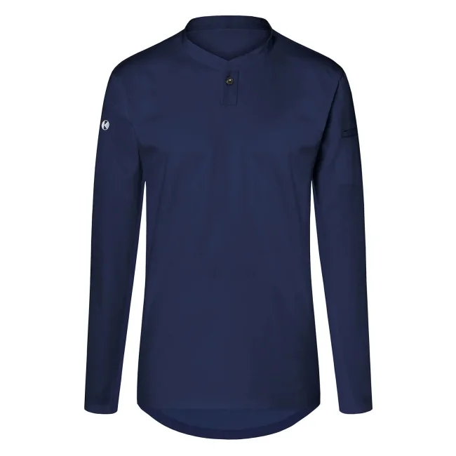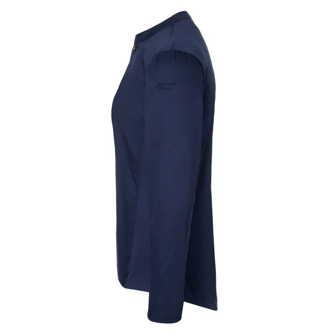Lato anteriore: 60% cotone, 40% poliestere, Lato posteriore: 100% jersey piqué poliestere. Moderna t-shirt da lavoro a maniche lunghe, traspirante e con regolazione dell'umidità, slim-fit, sciancrata in vita, colletto alto e abbottonatura corta, taschini con bottone, a filetto sul petto e sulla manica.