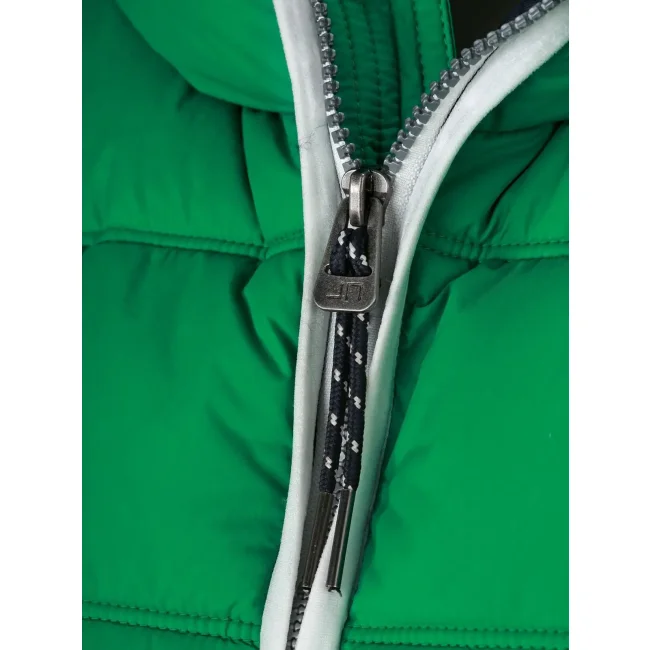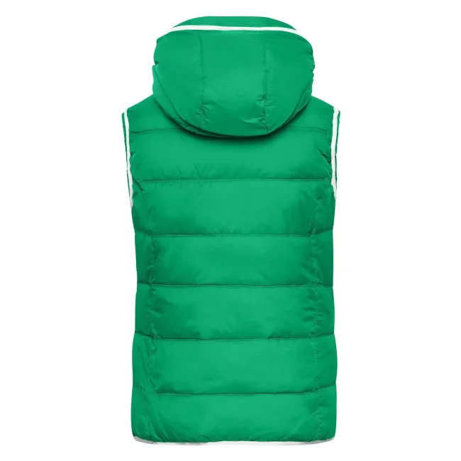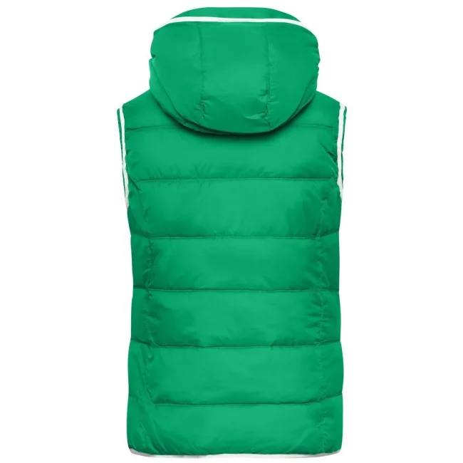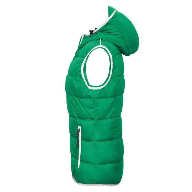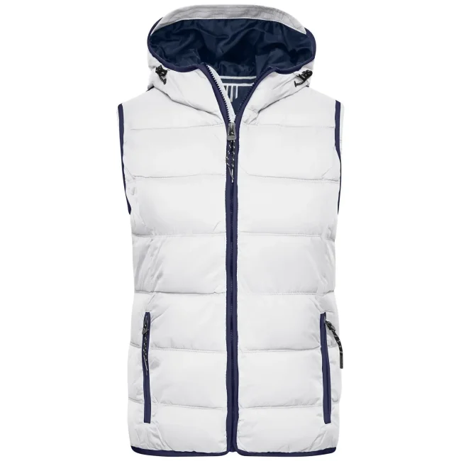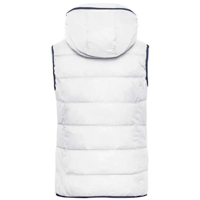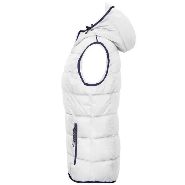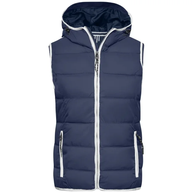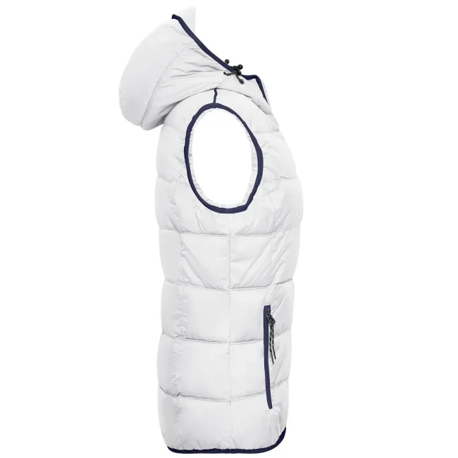 100% poliammide. Materiale esterno: 100% poliammide. Fodera e imbottitura: 100% poliestere. Gilet smanicato, imbottito e con cappuccio. Superificie opaca con leggero rivestimento in poliuretano, antivento e idrorepellente. Due tasche frontali e un taschino interno, giromanica elastico, cappuccio con cordino elastico e stopper. Leggermente sfiancato.