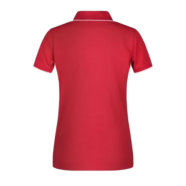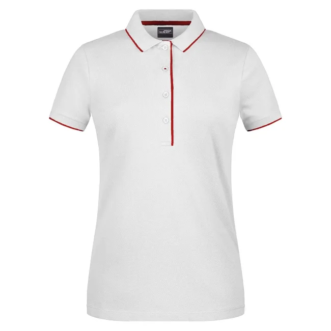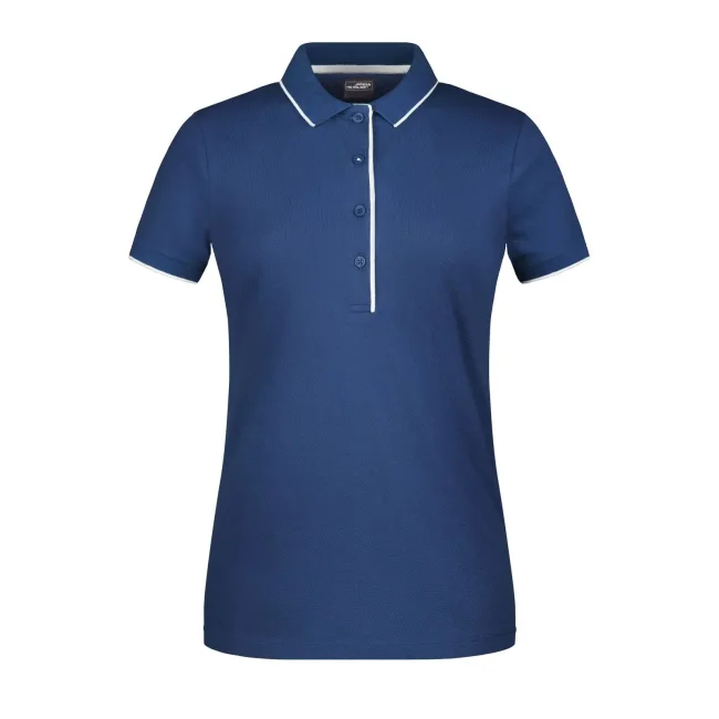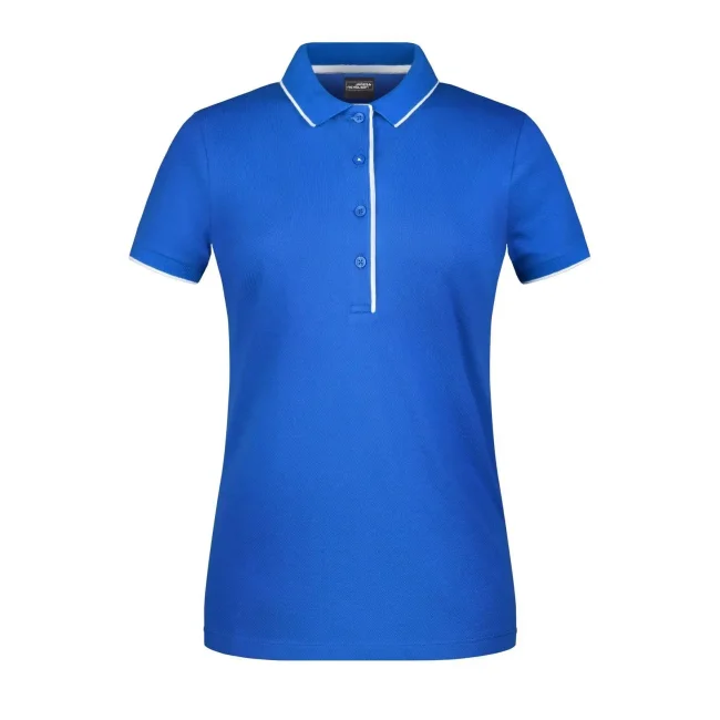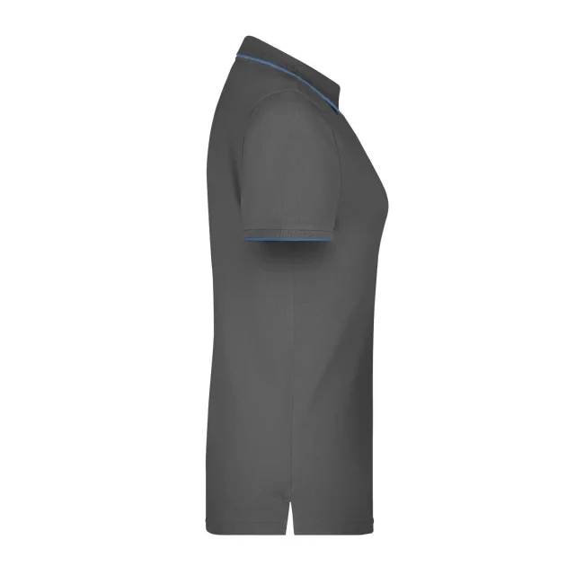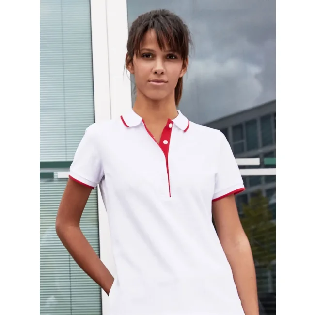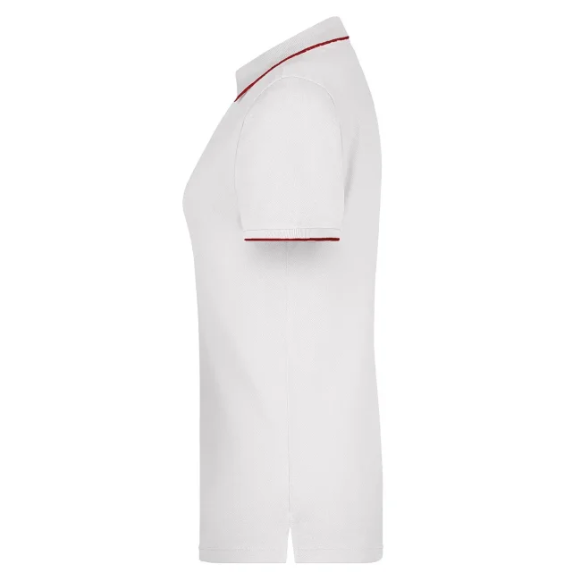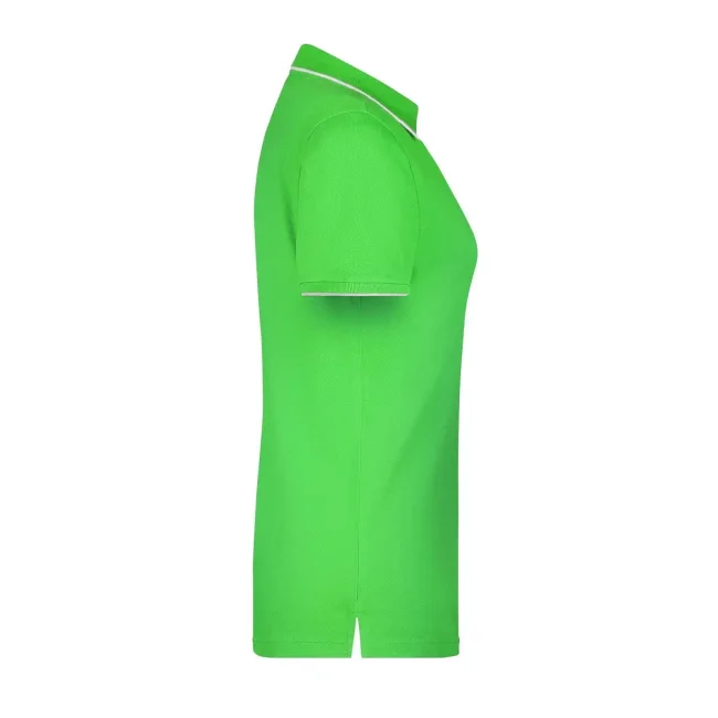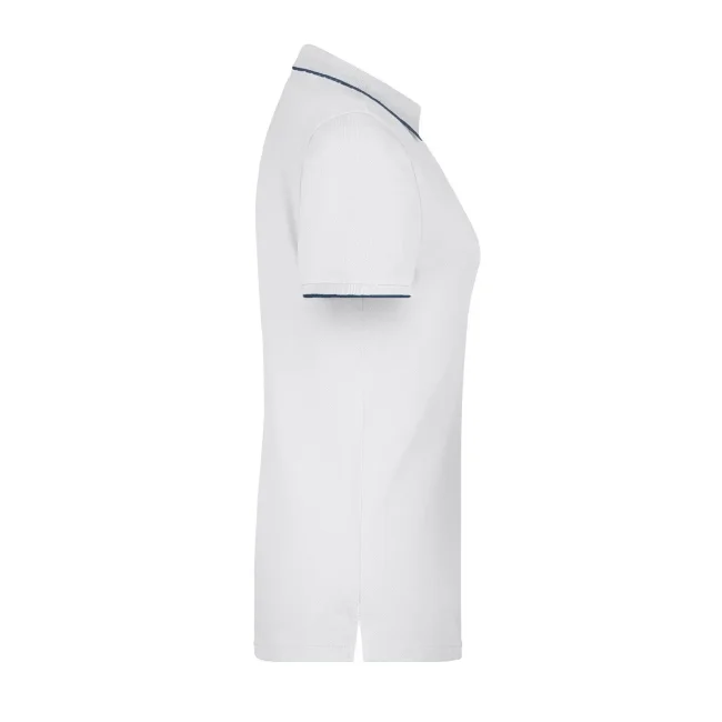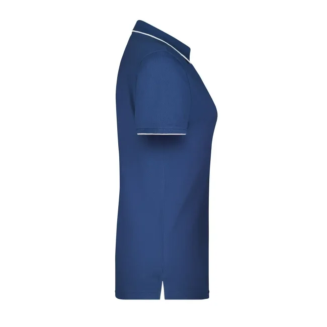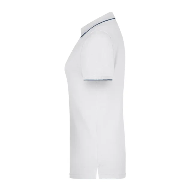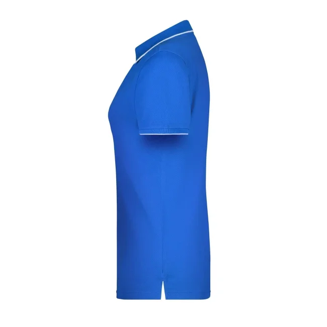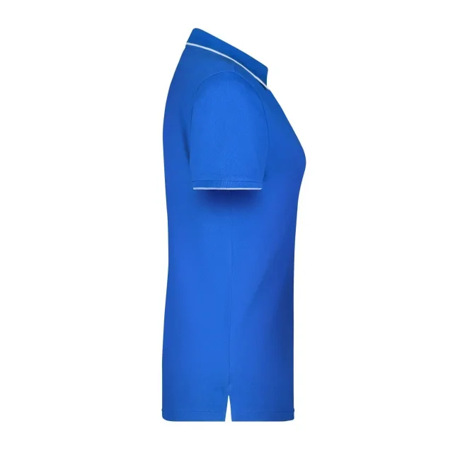 100% cotone pettinato ring-spun. Polo da donna in tessuto piqué, fettuccia nel collo e nelle maniche a costine, righe a contrasto sul collo, polsini tono su tono, spacchetti laterali, 4 bottoni.