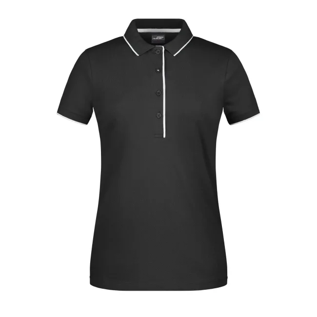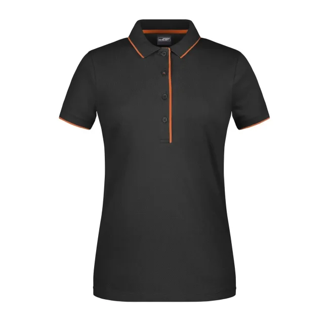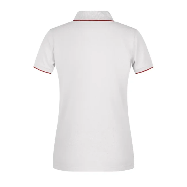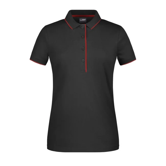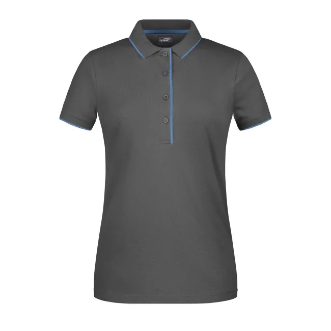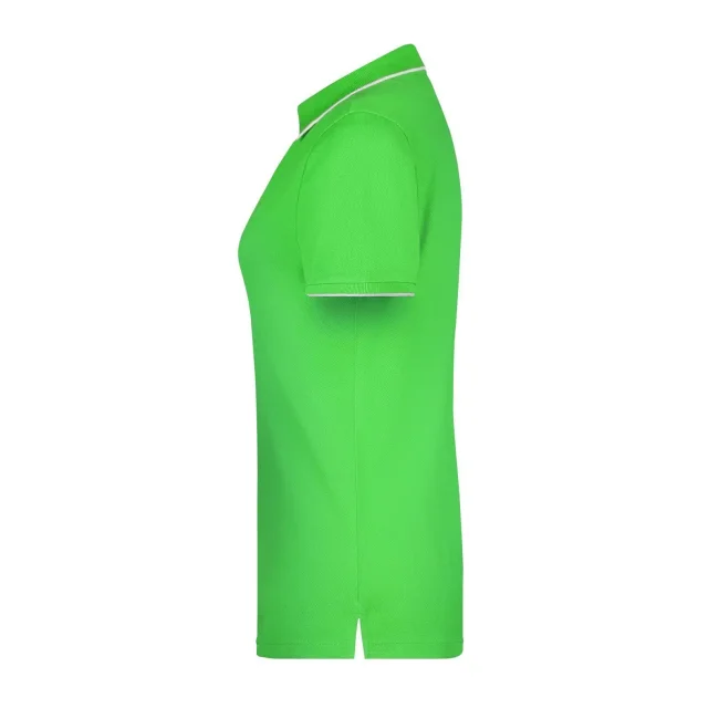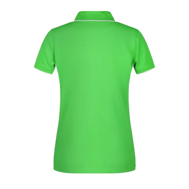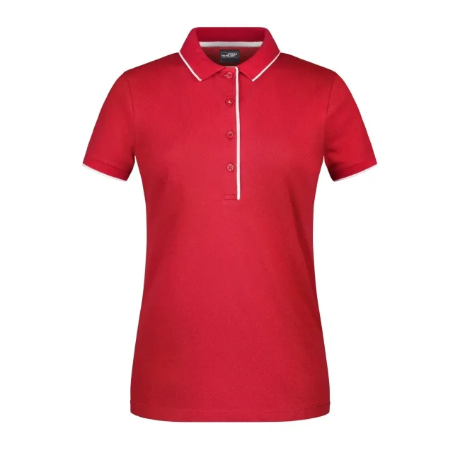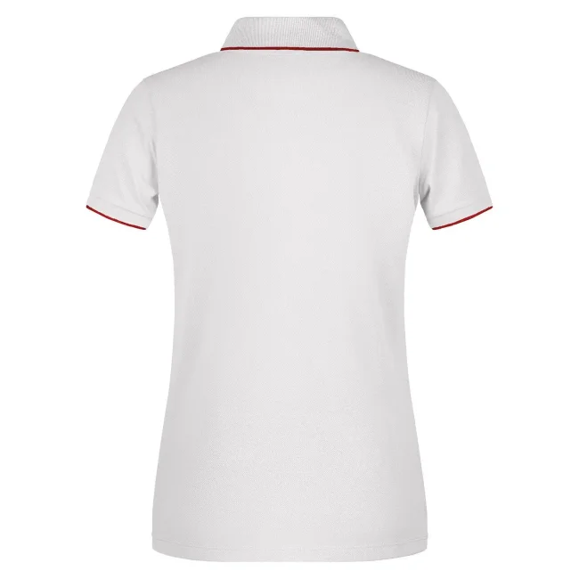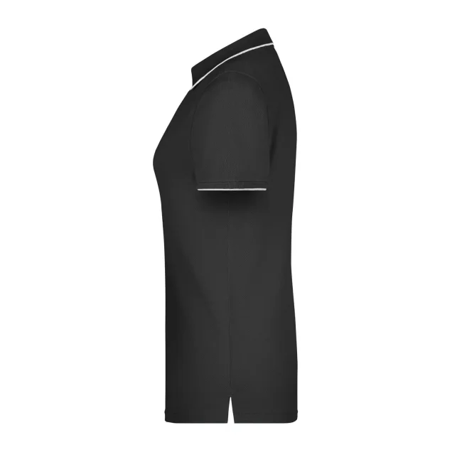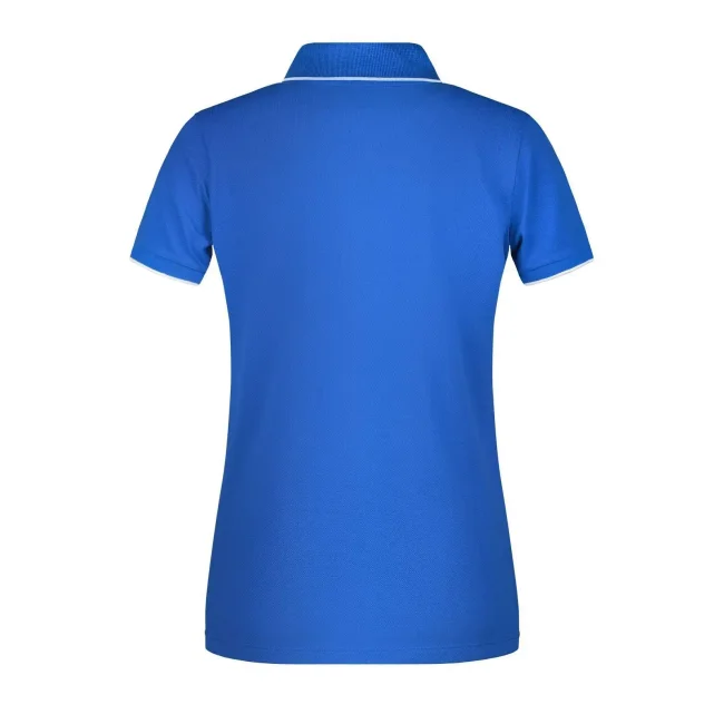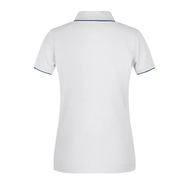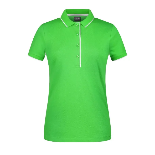 100% cotone pettinato ring-spun. Polo da donna in tessuto piqué, fettuccia nel collo e nelle maniche a costine, righe a contrasto sul collo, polsini tono su tono, spacchetti laterali, 4 bottoni.