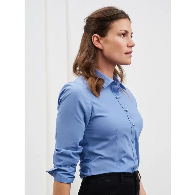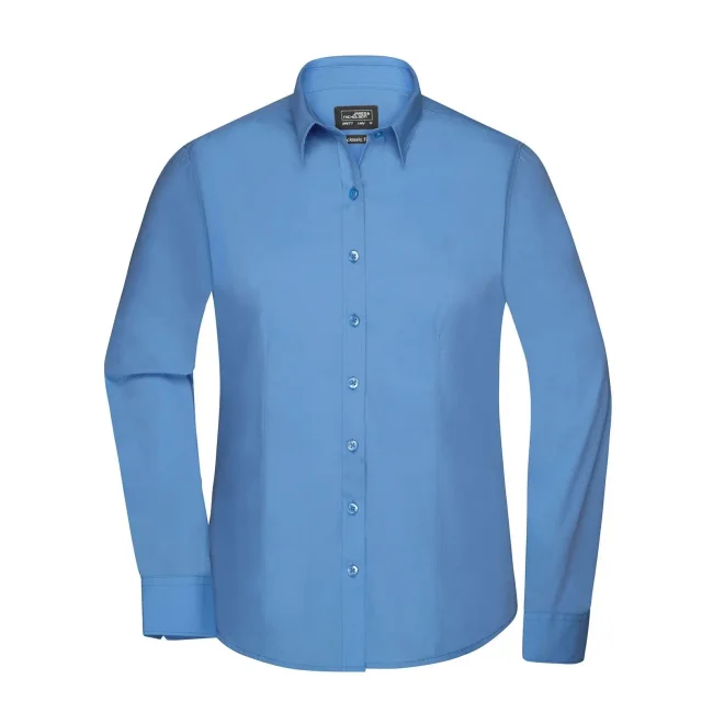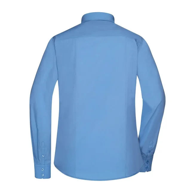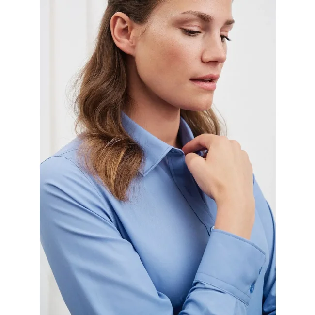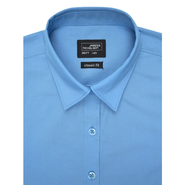 65% poliestere, 35% cotone. Camicia poplin easy care, con orlo arrotondato, taglio femminile leggermente sfiancato ai lati.