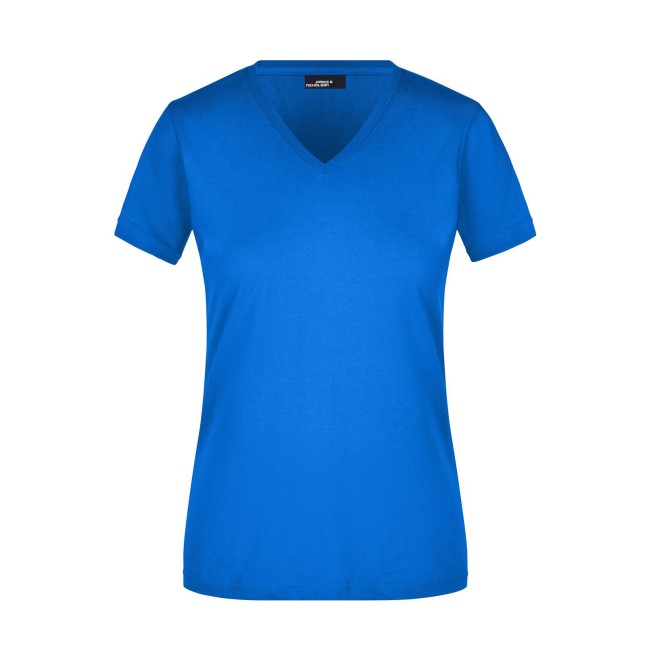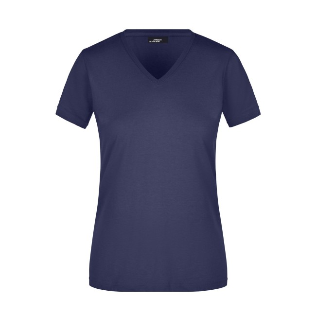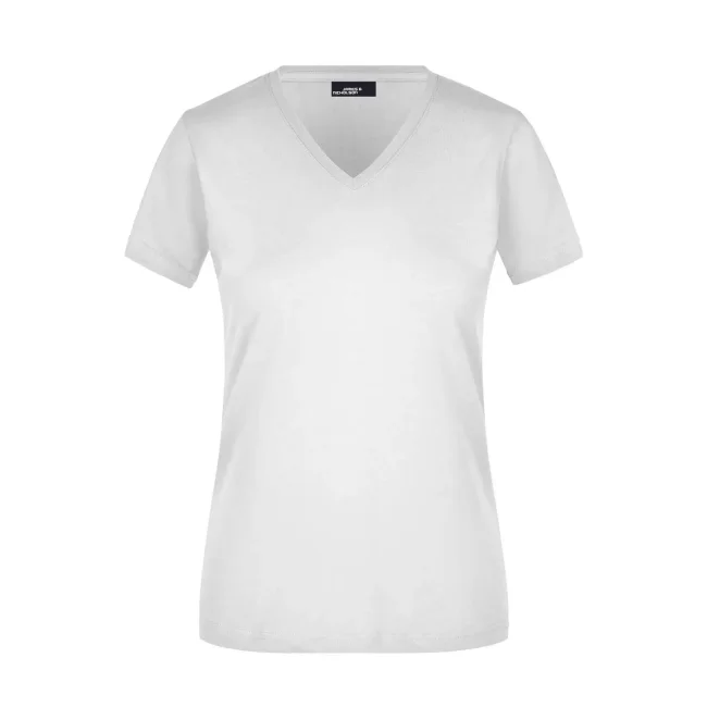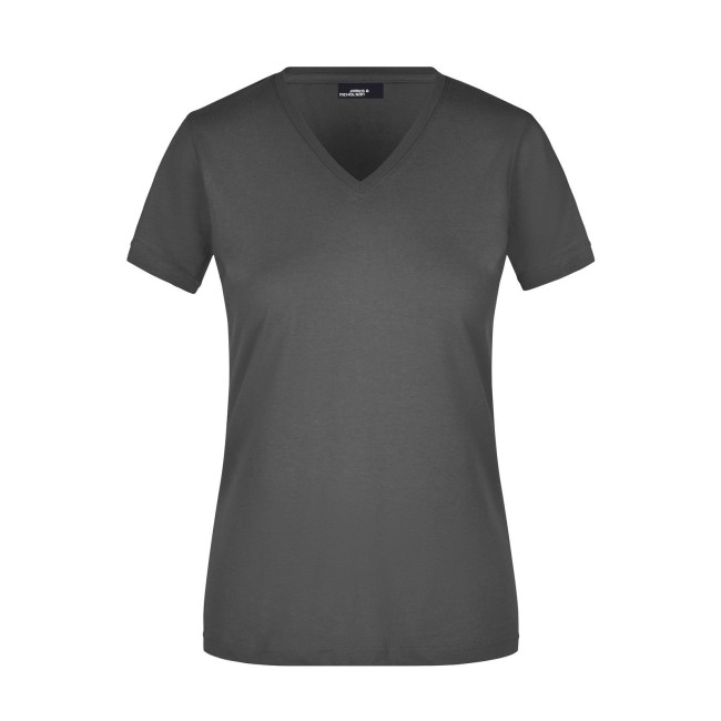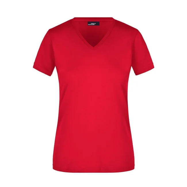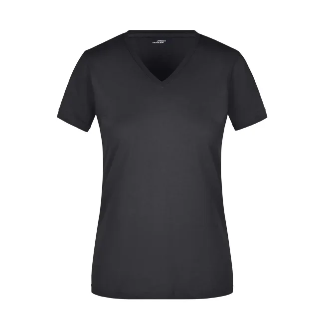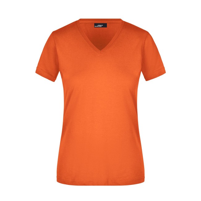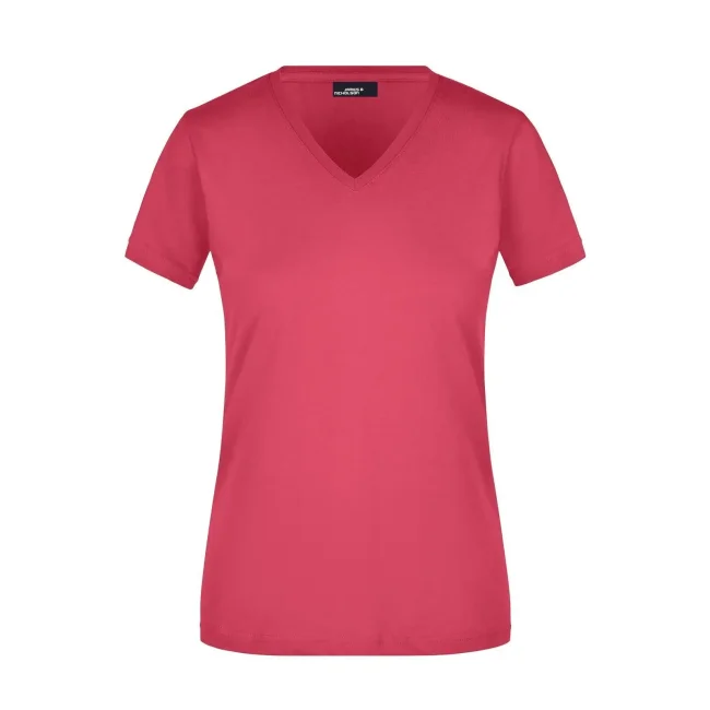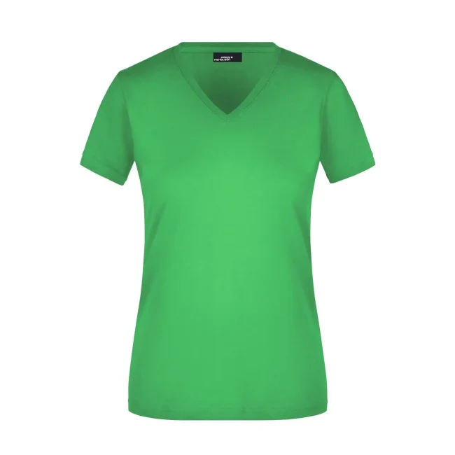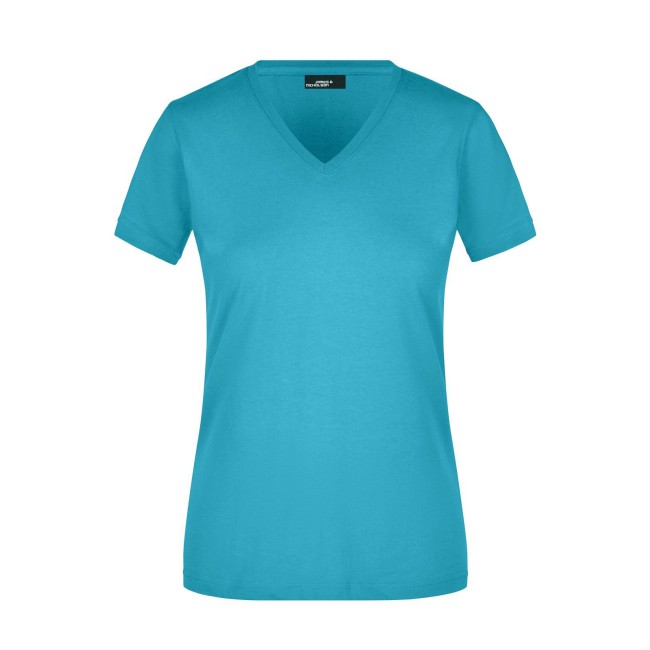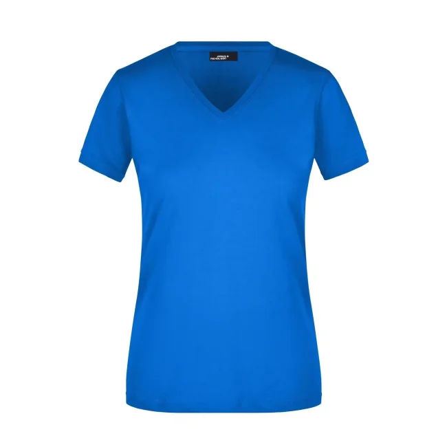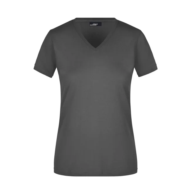 100% cotone. T-shirt slim-fit collo a V Single jersey che non si stringe e mantiene la sua forma, Forma slim-fit con cuciture laterali. Collo 1:1 bella nervatura. Tessuto esterno (160 g/m²), manica corta, Donna.